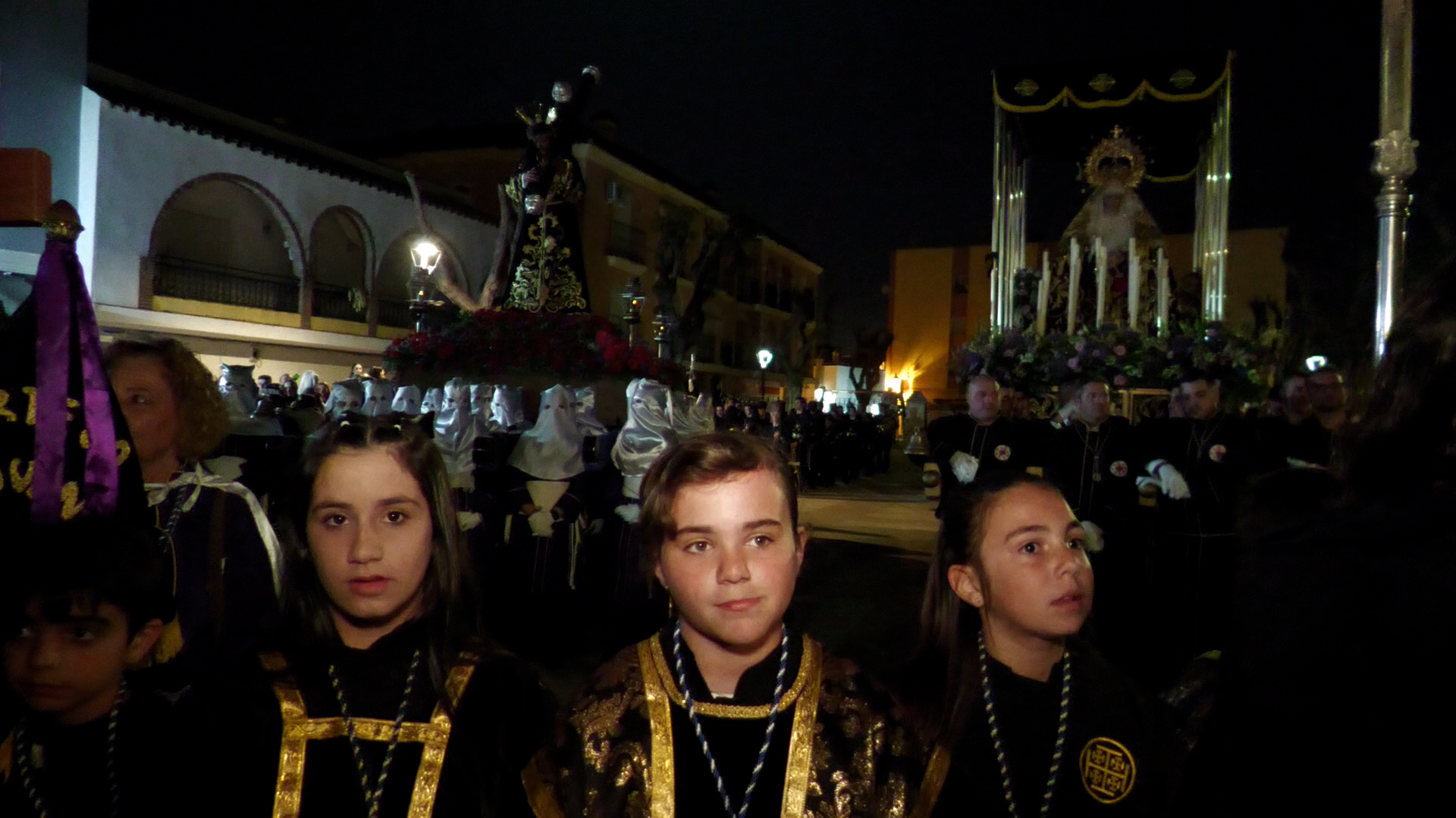 La barriada de la Estación de San Roque ha vivido en la noche de hoy, Miércoles Santo, su tradicional procesión protagonizada por las imágenes del Nazareno y la Virgen de los Dolores. Ambas imágenes partieron a la vez las 22.00 horas de la Parroquia de San Bernardo Abad, y en la Plaza de San Bernardo tuvo lugar un Santo Encuentro.