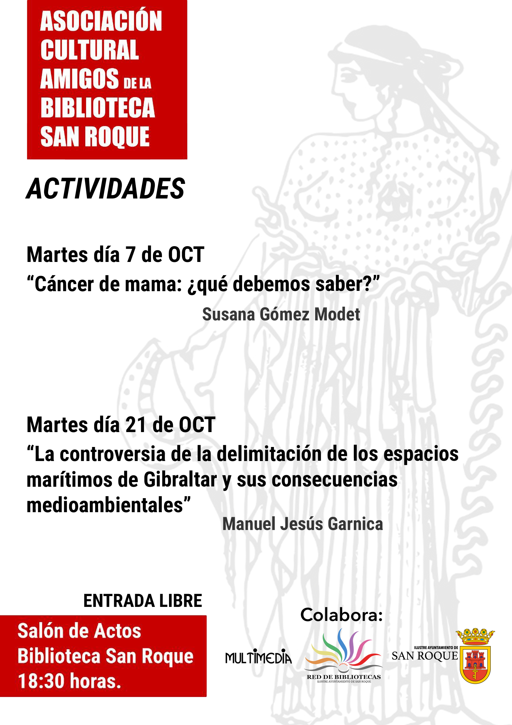La Red Municipal de Bibliotecas, que dirige la concejal Rocío Fernández, y la empresa municipal Multimedia colaboran con la Asociación Amigos de la Biblioteca de San Roque en las distintas actividades gratuitas que realiza este colectivo. Para el mes de octubre se han programado dos: el día 7, una charla sobre la información que se ofrece sobre el cáncer de mama y, el día 21, otra sobre la controversia de la delimitación de las aguas en Gibraltar. Ambas actividades se darán a las 18.30 horas en el salón de actos de la Biblioteca de San Roque, en el edificio Diego Salinas.