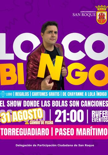 Tras el éxito de Loco Bingo el 1 de agosto en Los Olivillos, este domingo este show con canciones, regalos, bailes y diversión se llevará a cabo en el Paseo Marítimo de Torreguadiaro, a partir de las 21.00 horas. La próxima cita será el viernes 5 de septiembre en Campamento.