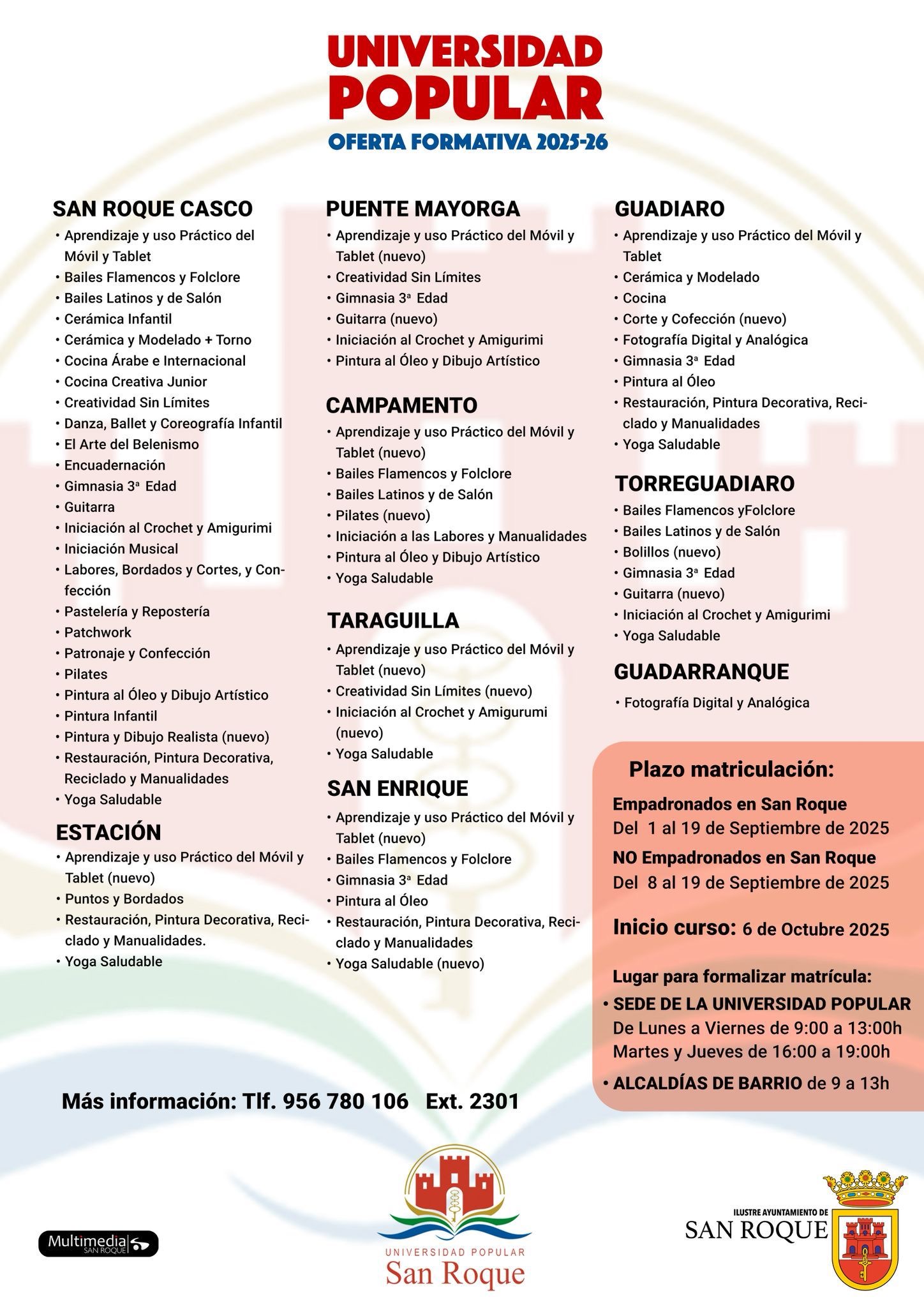 La Universidad Popular de San Roque oferta para el curso 2025-2026 más de 71 talleres tanto en la Ciudad como en barriadas. En cuanto a la fecha de inicio del curso, está prevista para el próximo 6 de octubre.