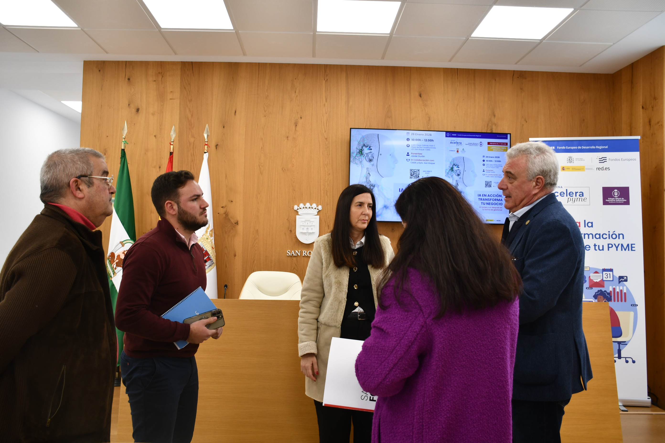 Junto al edil se encontraban Luis Lanme-Lenne y Vanessa Mena, gerentes de la oficina Acelera Pymes, quienes destacaron que San Roque es de los primeros municipios en realizar estos eventos en la provincia de Cádiz. “Lo que hacemos es brindarle a los emprendedores autónomos, pymes, y a todos aquellos que tengan ideas empresariales, los cauces y las herramientas necesarias, a través de la información, a través de eventos presenciales y en streaming, para que consigan los recursos que tengan que ver con la transición digital. Esto se lleva a cabo de una forma dinámica a través de eventos cortos y muy focalizados en lo demandado por los vecinos”.