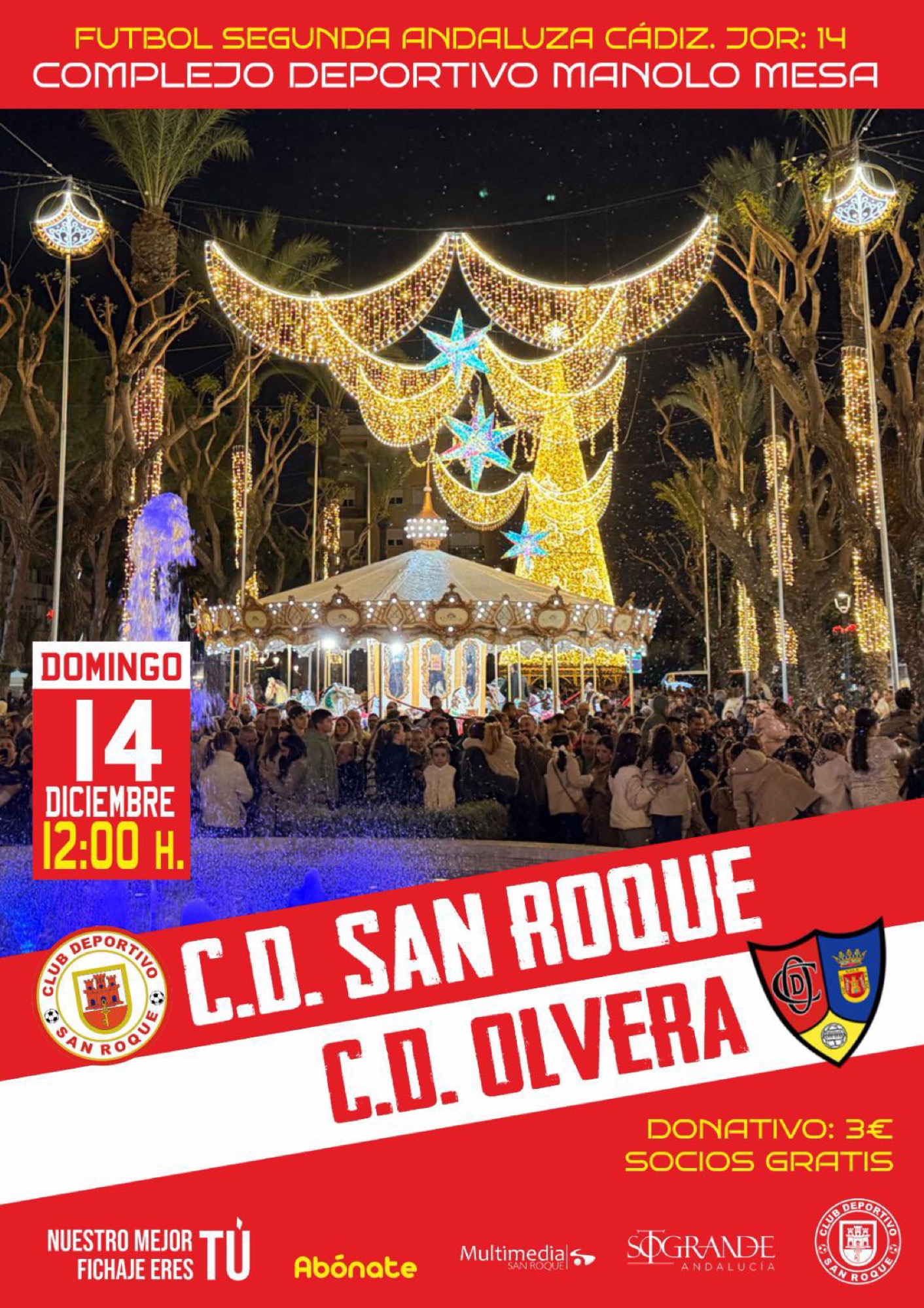 El Municipal Manolo Mesa acogerá este domingo a mediodía el partido entre el CD San Roque y el CD Olvera, correspondiente a la jornada 14 en Segunda Andaluza Cádiz. Con arbitraje de Ángel Sáez, los rojillos, segundos en la tabla, se enfrentarán al sexto clasificado.