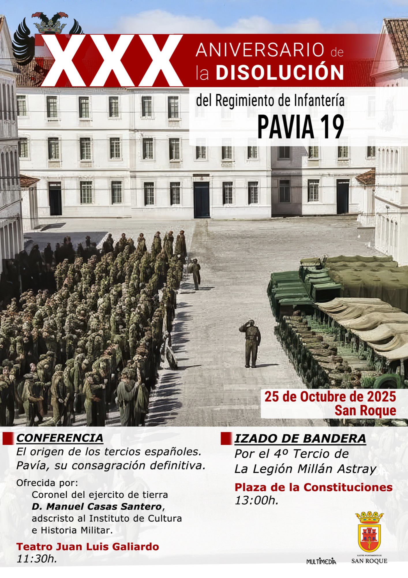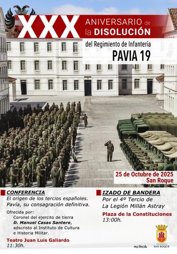 Con motivo del 30 aniversario de la disolución del Pavía 19, este sábado 25 se vivirán en San Roque varios actos, entre ellos un desfile del Cuarto Tercio de la Legión en la Plaza de las Constituciones, a las 12 del mediodía. Los teniente de alcalde de Seguridad Ciudadana, David Ramos, y de Tradiciones, María Collado, animan a los ciudadanos del municipio y de la comarca a asistir al acto y poder conocer más la historia militar de la ciudad.