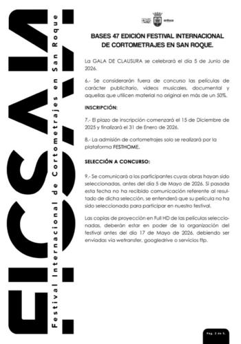 En las bases de la 47 Edición del Festival Internacional de Cortometrajes en San Roque se recoge que se celebrará del 1 y el 7 de junio de 2026 y que estará abierto a todos los realizadores, colectivos cinematográficos, escuelas de cine, asociaciones y productores. El plazo de inscripción de películas comenzó el 15 de diciembre de 2025 y finalizará el 31 de enero de 2026.