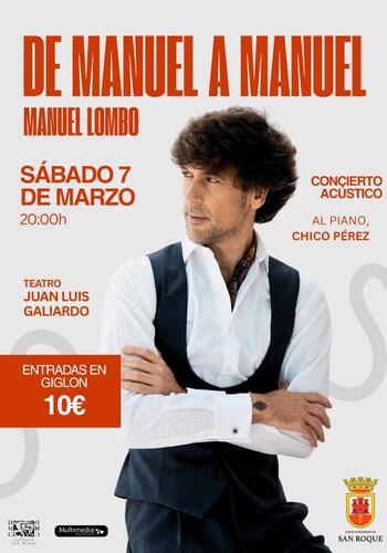El teatro Juan Luis Galiardo acogerá este próximo sábado 7 de marzo a partir de las 20:00 horas el espectáculo “De Manuel a Manuel” a cargo de Manuel Lombo, que supone el primer concierto en el teatro de la agenda cultural para el año 2026. Organiza la Delegación de cultura del Ayuntamiento de San Roque, que dirige la teniente de alcalde Ana Ruiz.