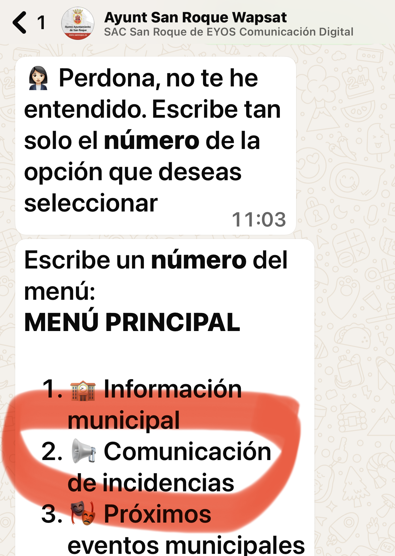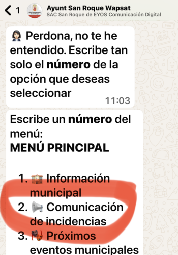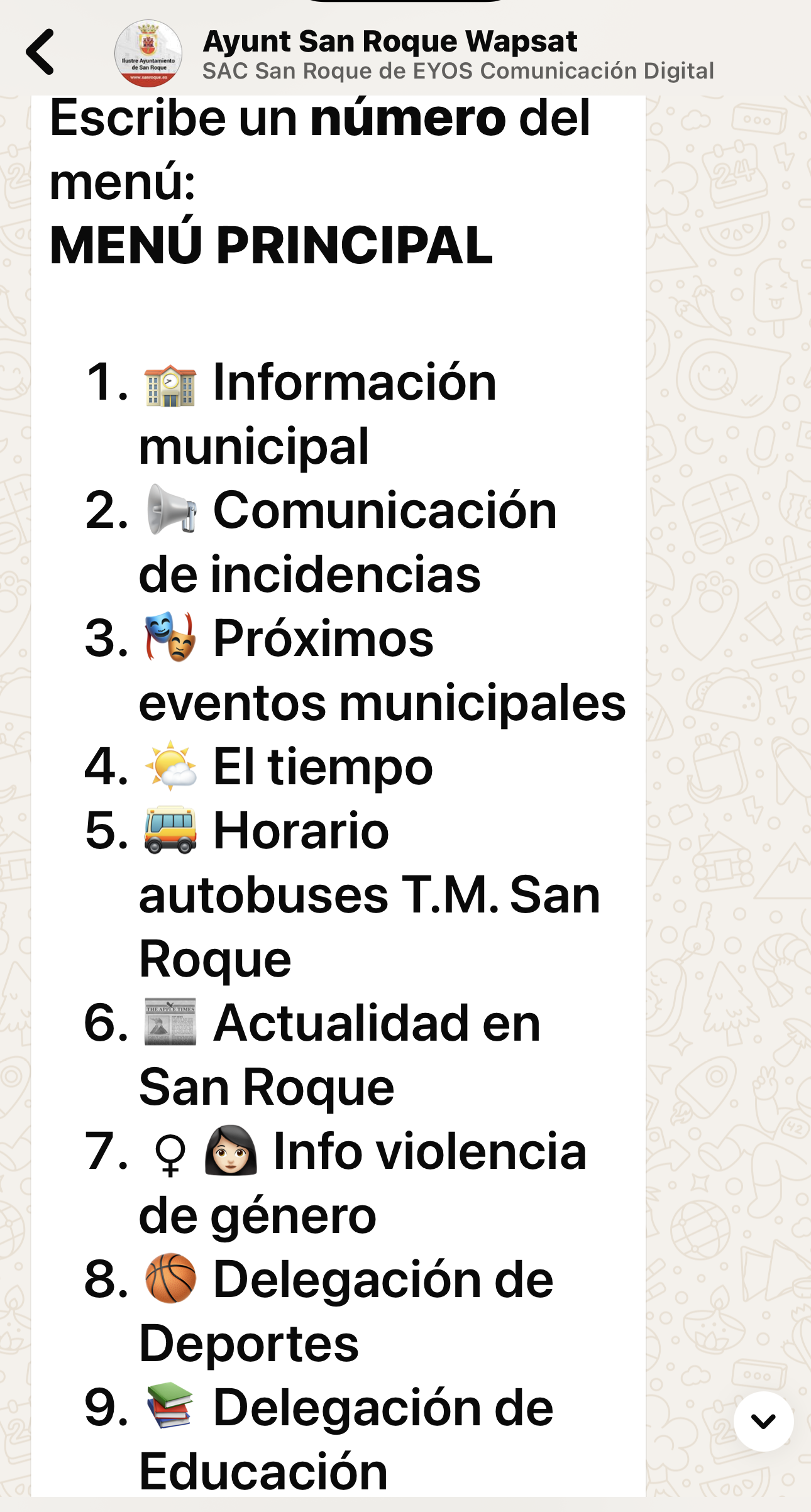 Además de esta funcionalidad, tecleando la palabra “Hola” se accede al menú principal, que ofrece distintas opciones: 1) Información municipal; 2) Comunicación de incidencias; 3) Próximos eventos municipales 4) El Tiempo; 5) Horario autobuses T.M. San Roque; 6) Actualidad San Roque; 7) Info Violencia Género; 8) Delegación de Deportes; 9) Delegación de Educación; 10) Cita previa FNMT; 11) Club de Trabajo; 12) Universidad Popular; 13) Tablón de Anuncios; 14 Sede electrónica; 15) Mis preferencias; 16) Finalizar.