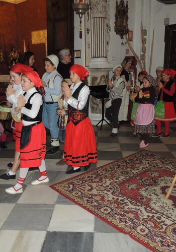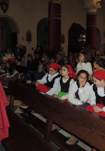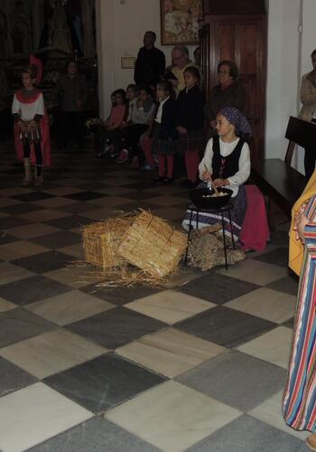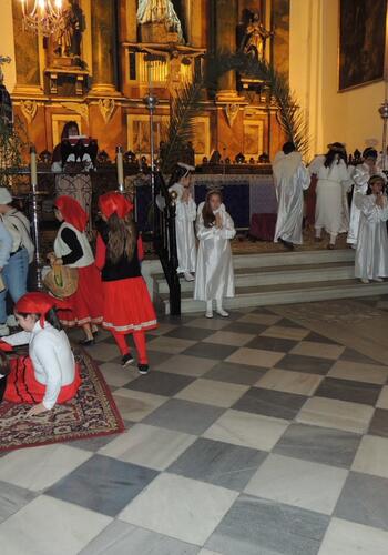 Los niños escenificaron algunos momentos bíblicos sobre el Nacimiento de Jesús, ataviados con la indumentaria y los enseres de la época, ante una parroquia totalmente llena para disfrutar de una imagen tan singular, y que ya es tradicional en San Roque.