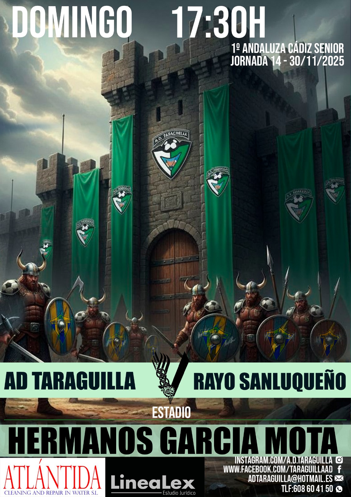 La AD Taraguilla acogerá en su campo, el Hermanos García Mota, al por ahora invicto CD Rayo Sanluqueño que se encuentra en el primer puesto de la tabla clasificatoria. El partido tendrá lugar desde las 17.30 horas.
