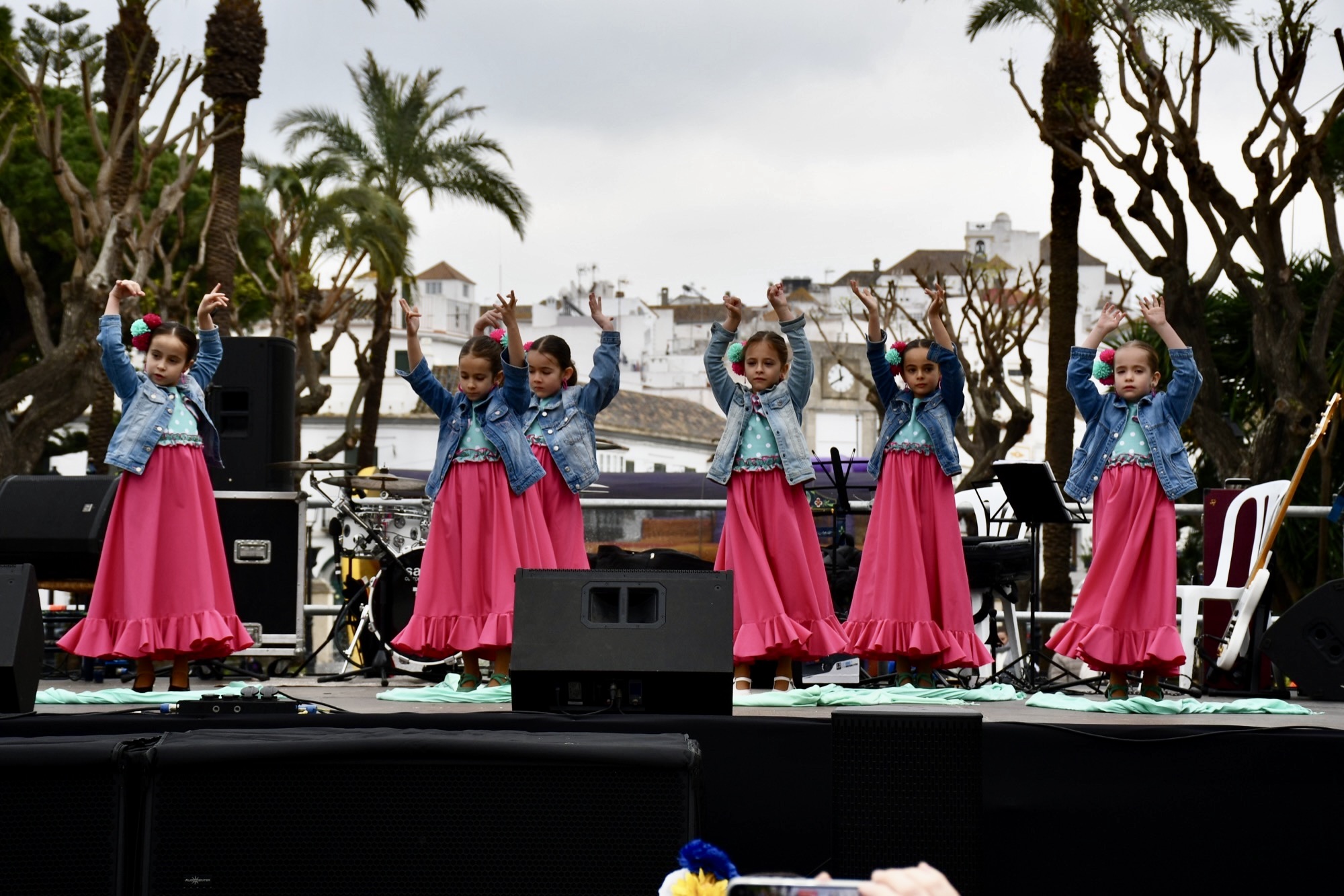 Las actuaciones en el escenario comenzaron a las 11.15 horas con varios pases de baile a cargo de la Asociación Cultural Flamenca de Vanessa Orrán, mientras muchos pequeños disfrutaban de atracciones hinchables y de talleres de manualidades. A mediodía tuvo lugar el izado de la bandera andaluza y la música del himno, y luego las autoridades presentes procedieron a brindar por Andalucía tras ser servidos por un venenciador.