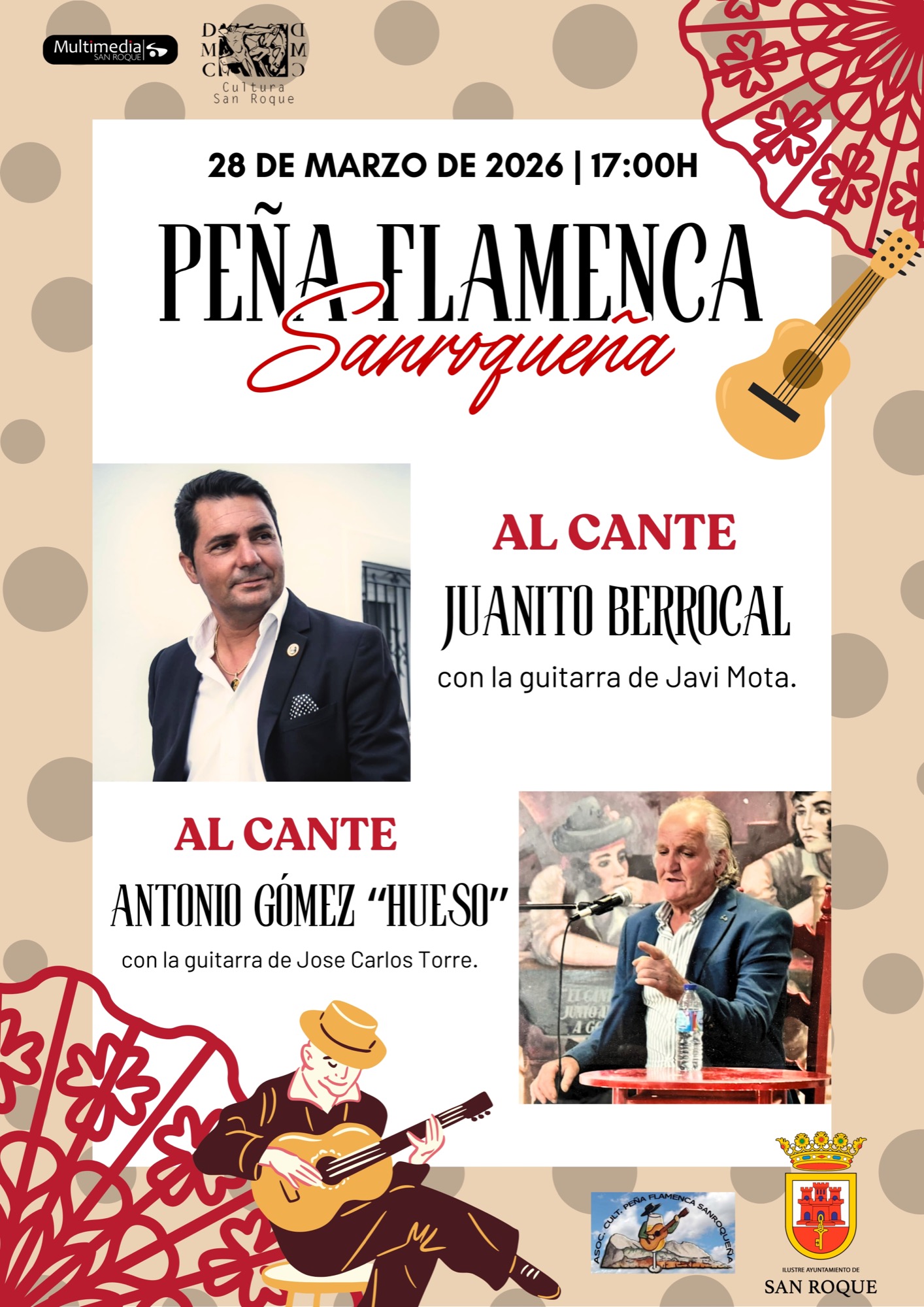 La Peña Flamenca Sanroqueña organiza para la tarde del Sábado de Pasión, 28 de marzo, un recital a cargo de los cantaores Juanito Berrocal y Antonio Gómez “Hueso”. Colabora el Ayuntamiento de San Roque.