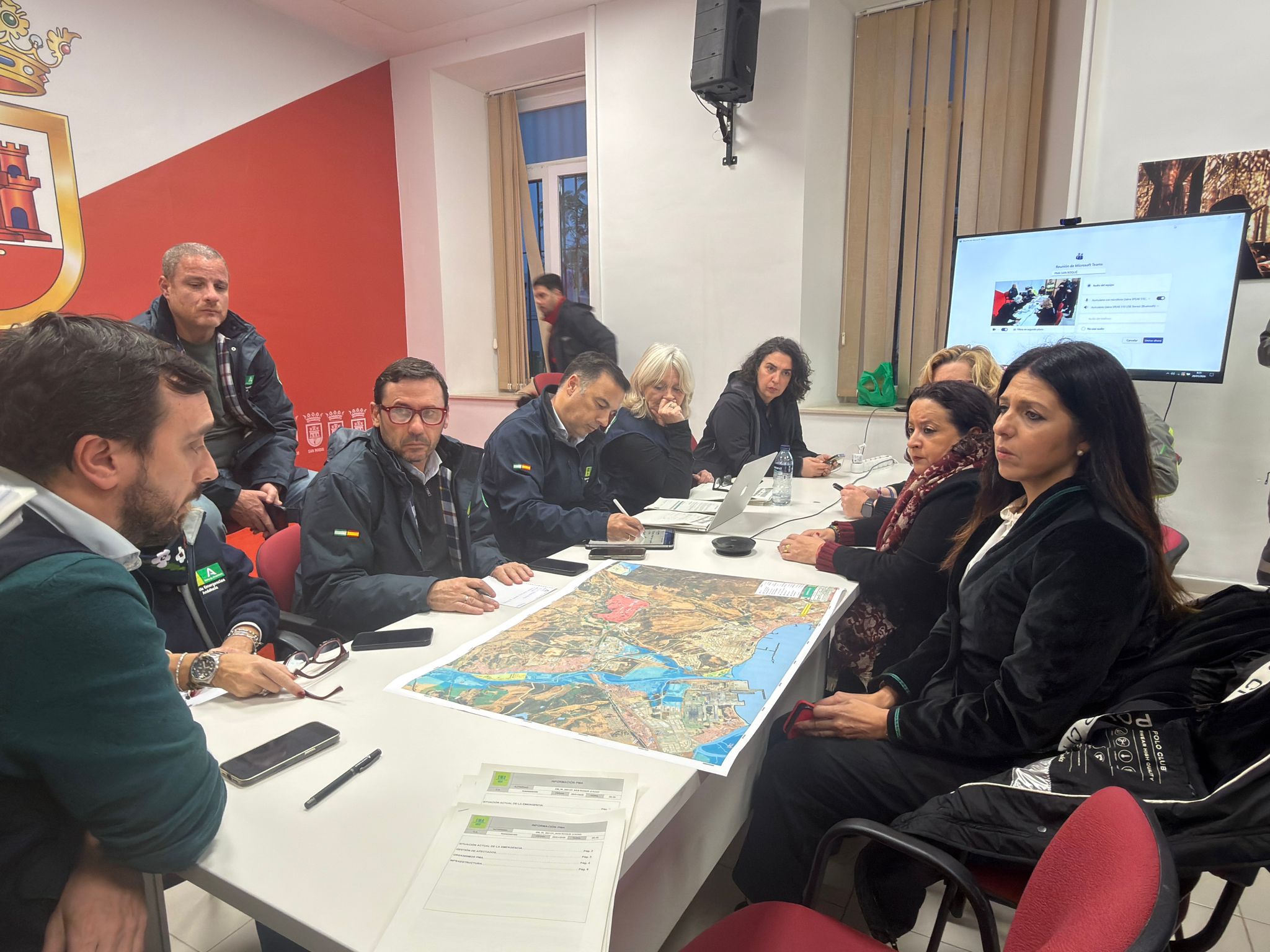 La alcaldesa accidental de San Roque, María del Mar Collado, junto al delegado de Seguridad, David Ramos, y otros ediles, han estado presentes en todo momento en el centro de mando avanzado instalado por la Junta de Andalucía, y en el que se están adoptando diversas decisiones para afrontar está alerta.