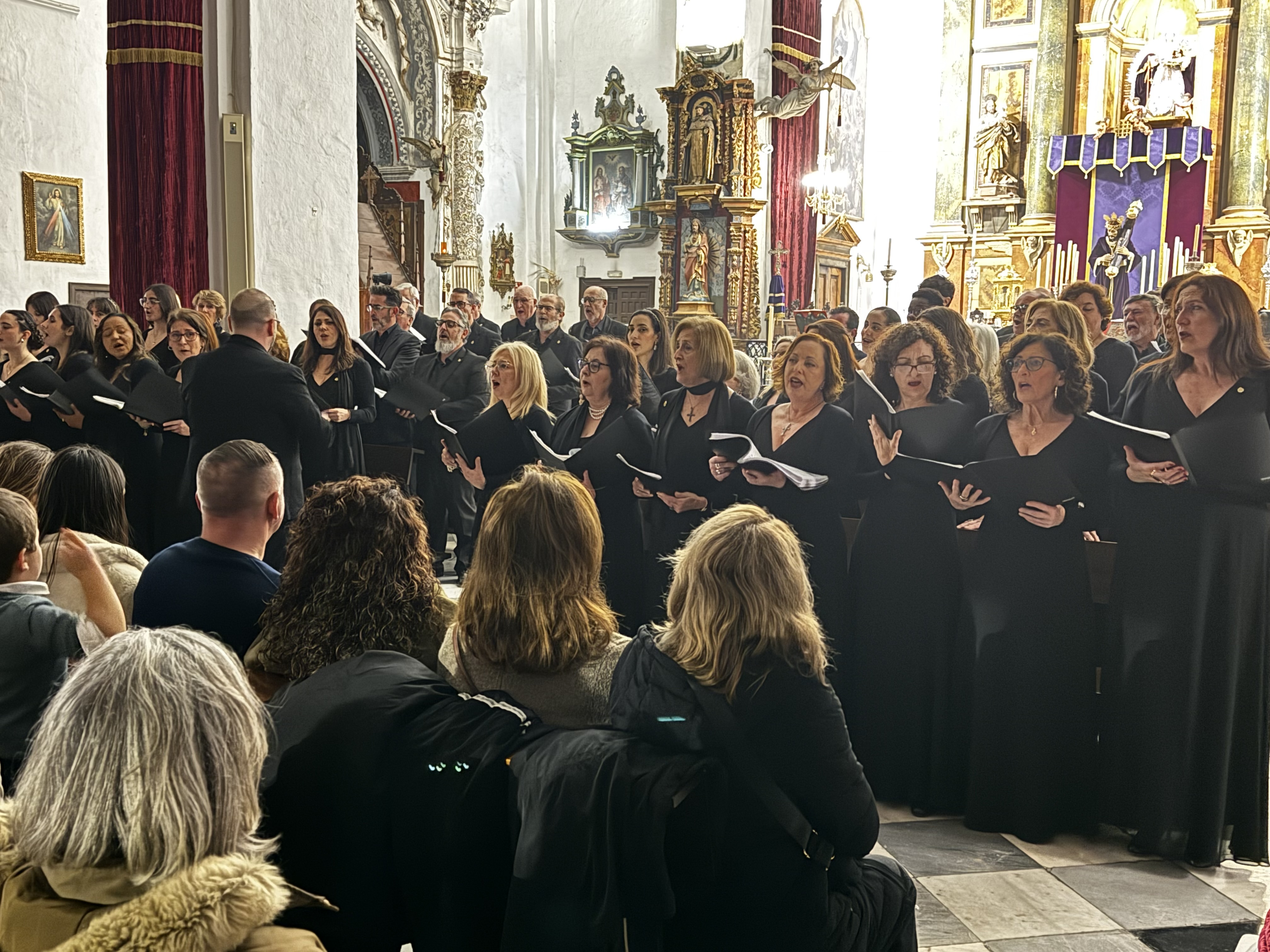 El público no faltó a su cita este sábado en la Parroquia Santa María La Coronada, donde un año más la Banda de Música de Jimena y la Coral Portus Albus de Algeciras ofrecieron el concierto de Cuaresma “La Pasión Cantada”.