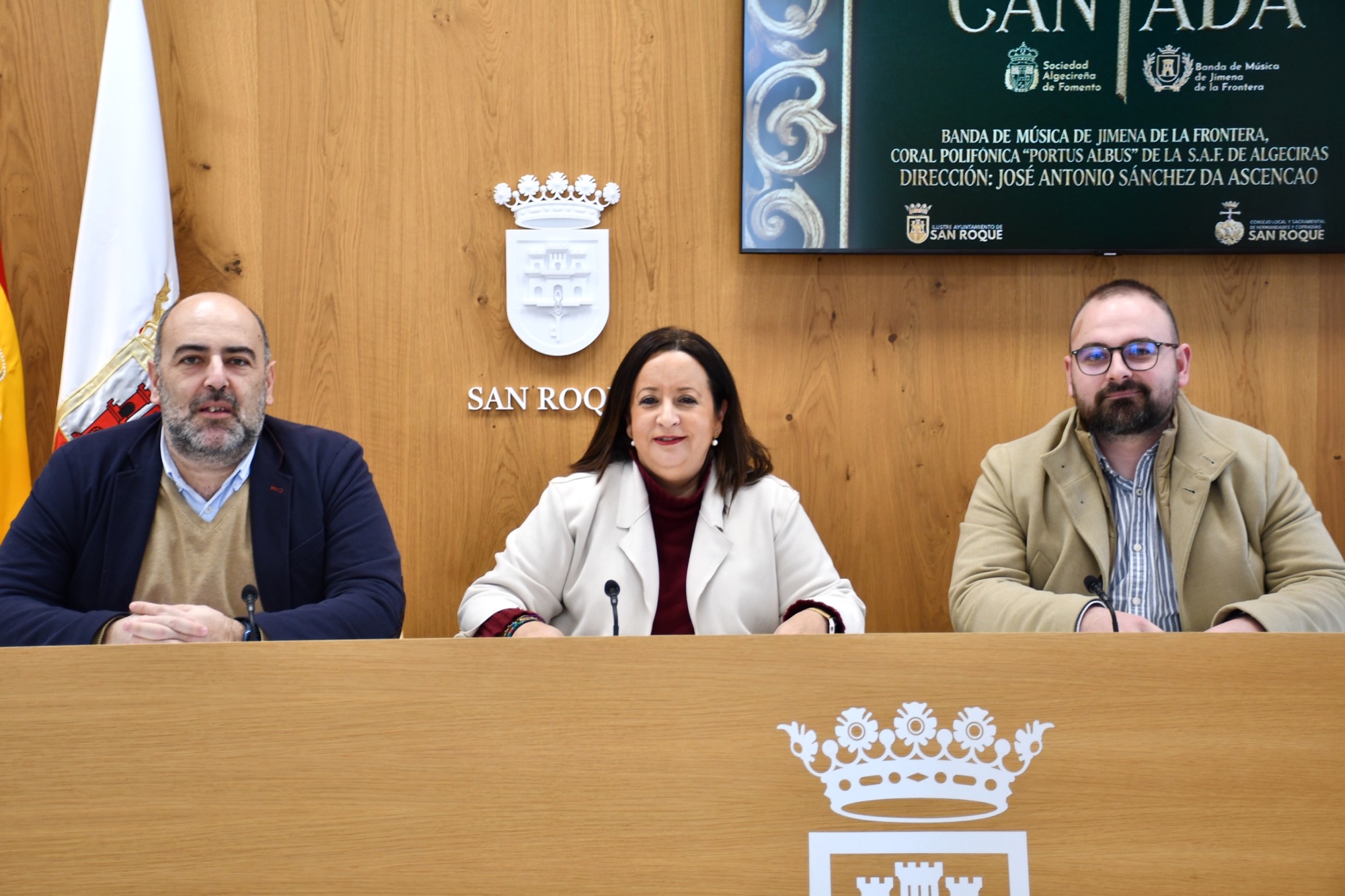 La teniente de alcalde delegada de Tradiciones, María Collado, junto al presidente del Consejo Local y Sacramental de Hermandades y Cofradías de San Roque, José Luis Perales, y el director del espectáculo, José Antonio Sánchez do Ascensao, presentaron el concierto.