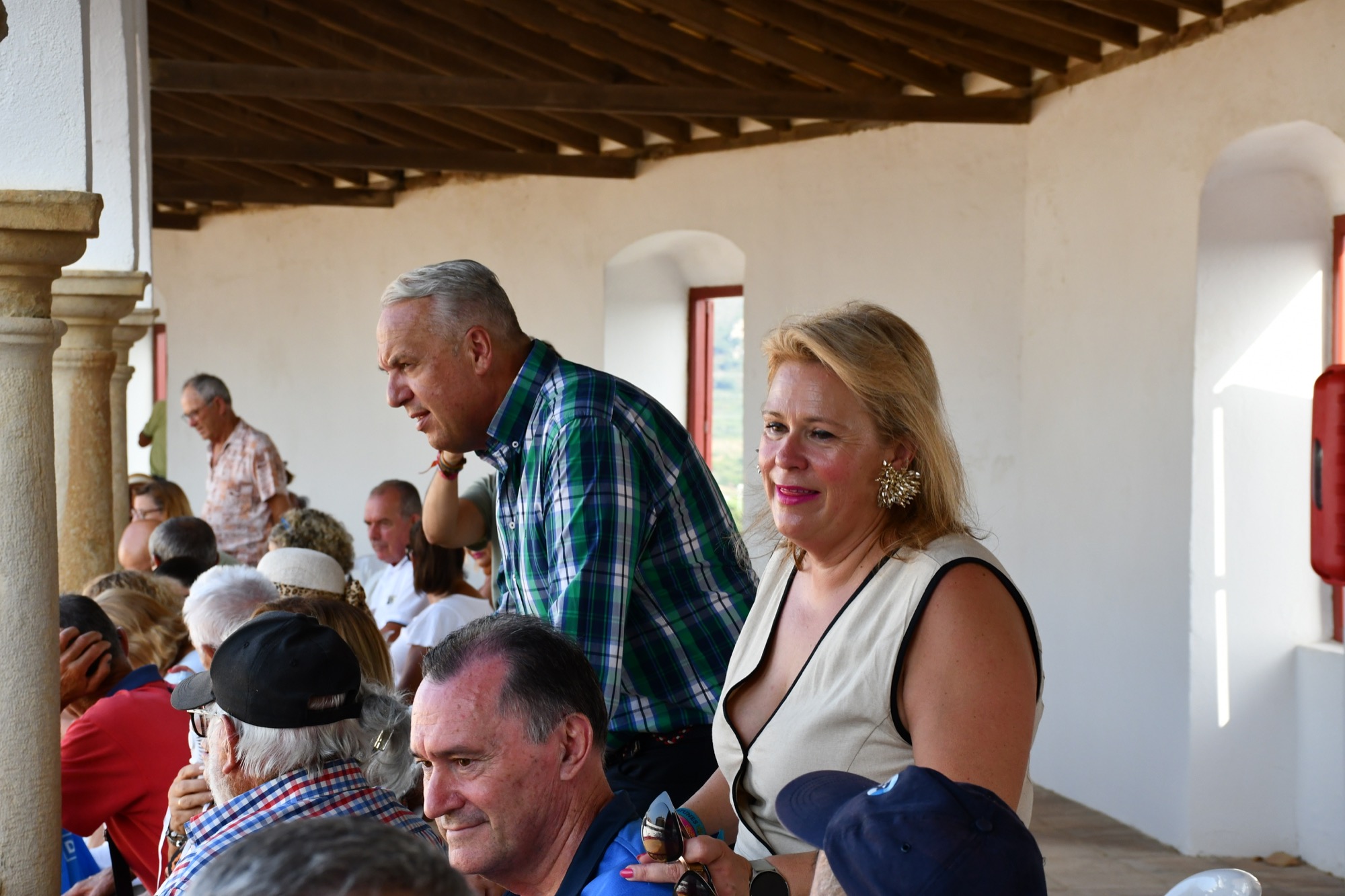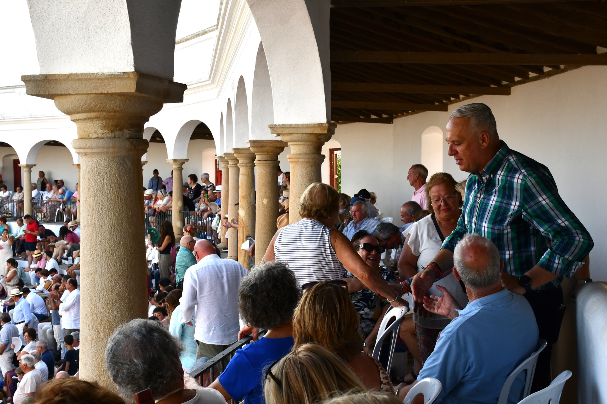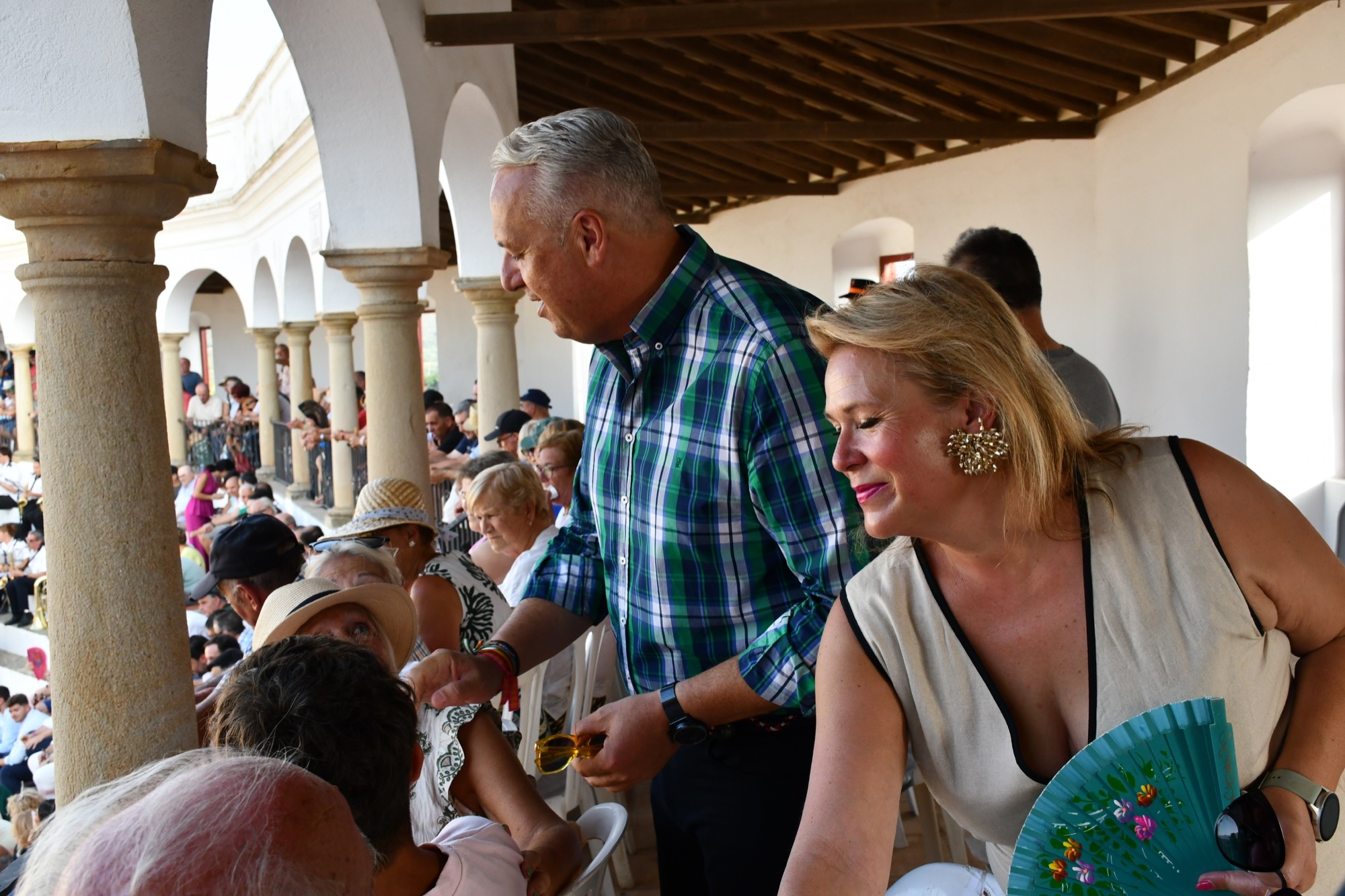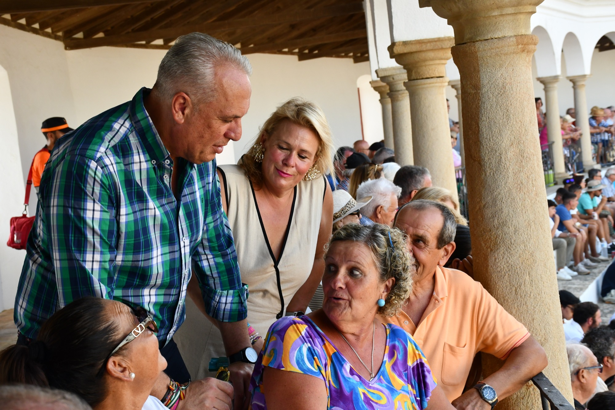 El alcalde, Juan Carlos Ruiz Boix, y la concejal de Igualdad y Asuntos Sociales, Eva Gil, han saludado a los mayores sentados en tendido sombra en la parte alta del coso sanroqueño con motivo de la gran corrida de toros de la Feria Real. Así, mayores de 65 años que han adquirido las autorizaciones que les ha emitido el Ayuntamiento solo han tenido que abonar la cantidad de 5 euros.