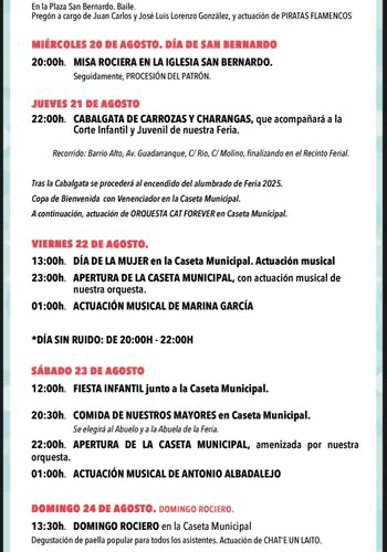 En cuanto al sábado 23, a las 12.00 horas se celebrará la Fiesta Infantil junto a la Caseta Municipal. A las 20.30 horas, en la Cena de Nuestros Mayores en la Caseta Municipal, donde se elegirá al Abuelo y a la Abuela de la Feria de la Estación 2025. A las 22.00 horas tendrá lugar la apertura de la Caseta Municipal, que contará con música de orquesta, estando prevista a la 1.00 la actuación de Antonio Albadalejo.