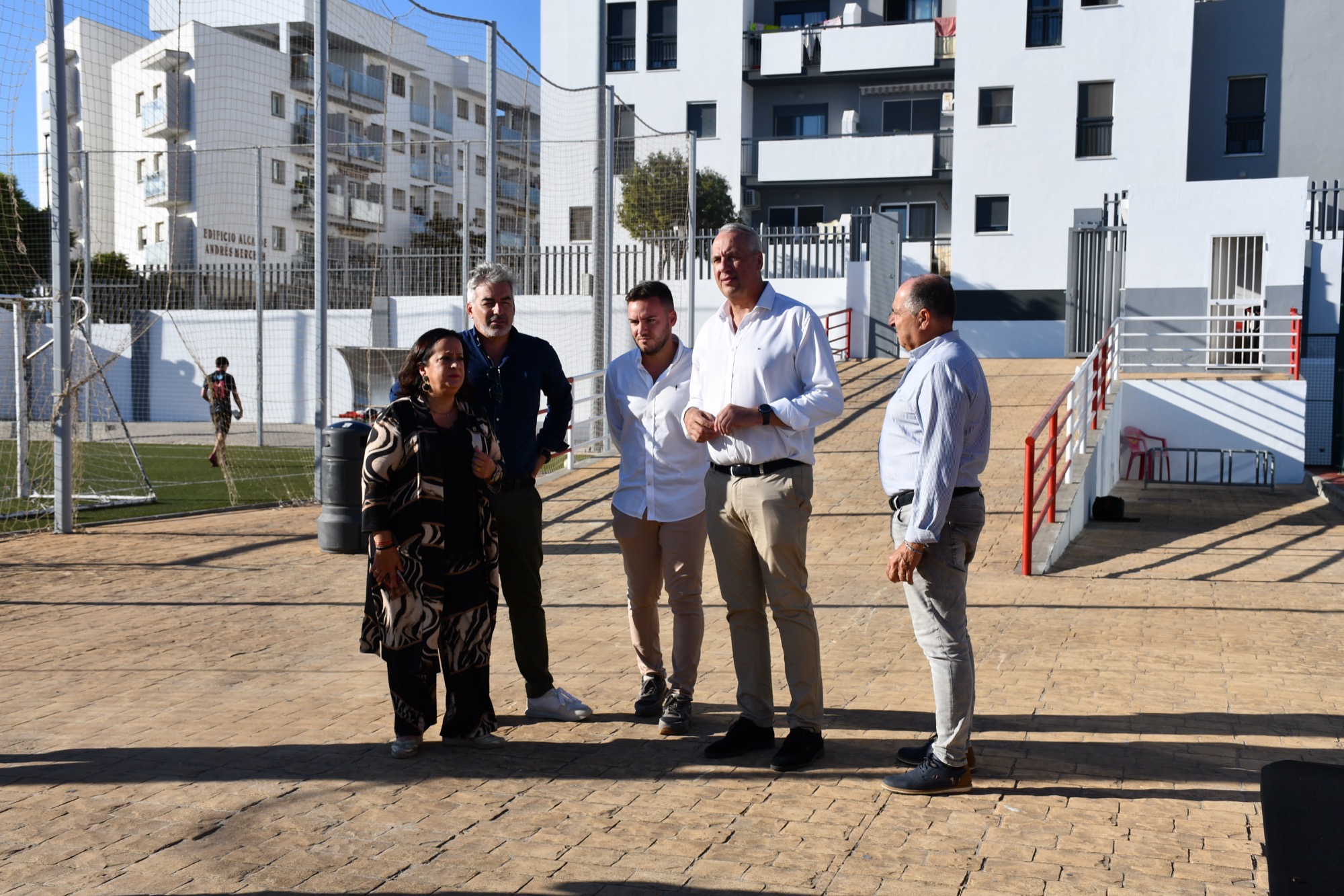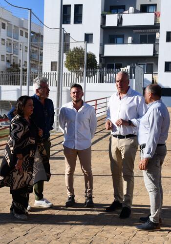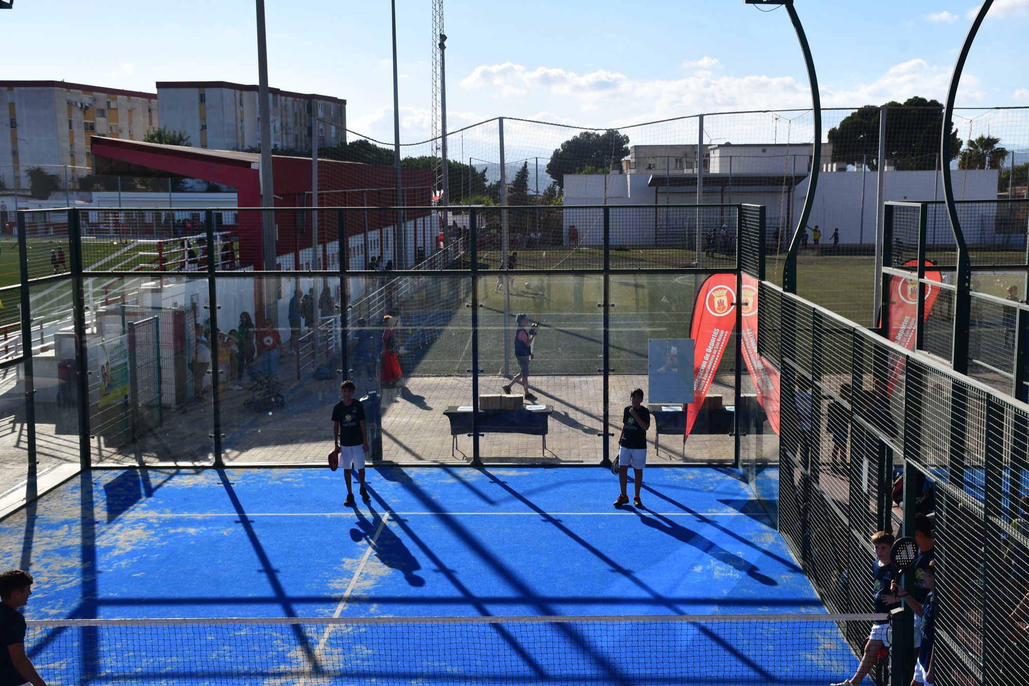 El alcalde de San Roque, Juan Carlos Ruiz Boix, junto al delegado de deportes, Fernando Vega, otros miembros de la Corporación y técnicos municipales visitaron las instalaciones. El primer edil espera que “esta inversión en las tres pistas de pádel, de 20.000 euros, no sea solo la renovación de un firme de hace 15 años, sino que este nuevo material combine tanto conservación como desgaste por el gran uso de los jugadores”.