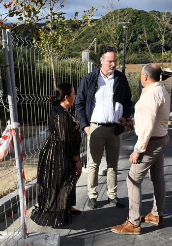 La teniente de alcalde delegada de Urbanismo, Maria del Mar Collado, junto al delegado responsable de la zona de Estación, Miraflores y Taraguilla, Juan Serván, visitaron las obras de acerado y luminaria realizadas en la calle Ébano, ubicada en el polígono La Pólvora, en Taraguilla.
