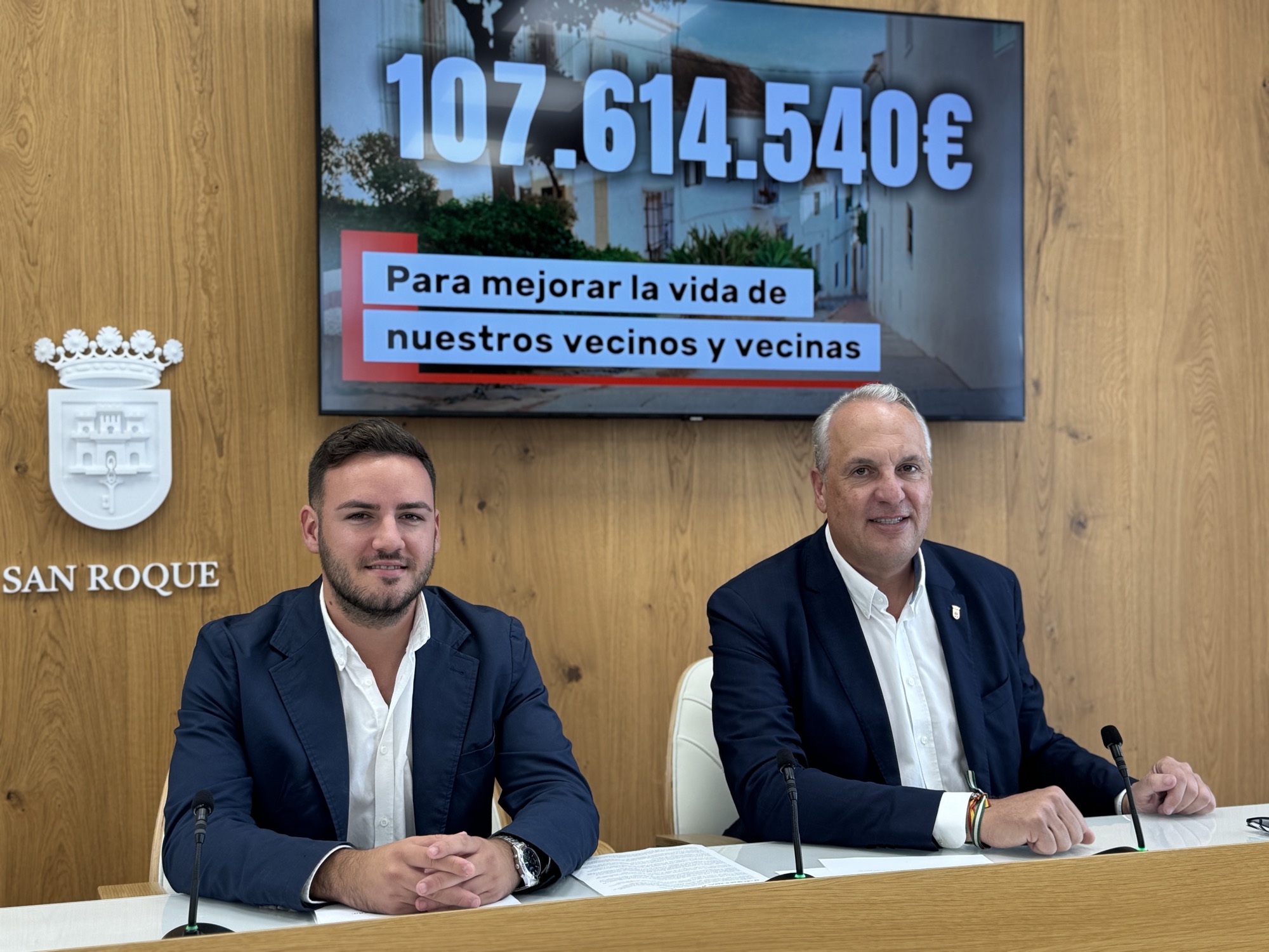 El alcalde de San Roque, Juan Carlos Ruiz Boix, y el teniente de alcalde de Hacienda, Fernando Vega, han presentado el documento inicial del Presupuesto General del Ayuntamiento para 2026. Un año más, San Roque es de los primeros consistorios españoles en hacer públicas sus cuentas para el próximo ejercicio. La cifra final supera los 107,6 millones de euros, 14,2 millones más que en el ejercicio actual (un incremento del 15%).