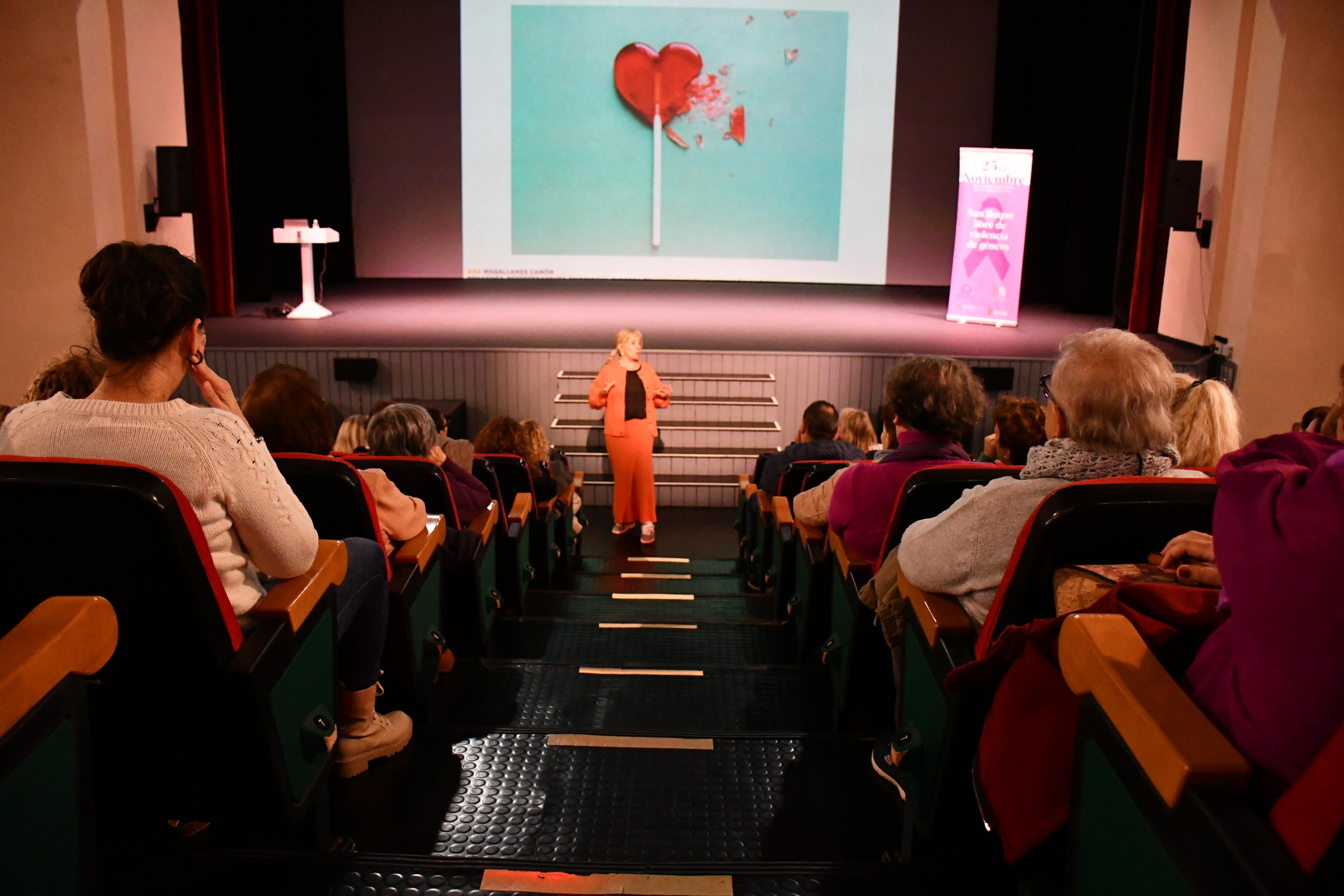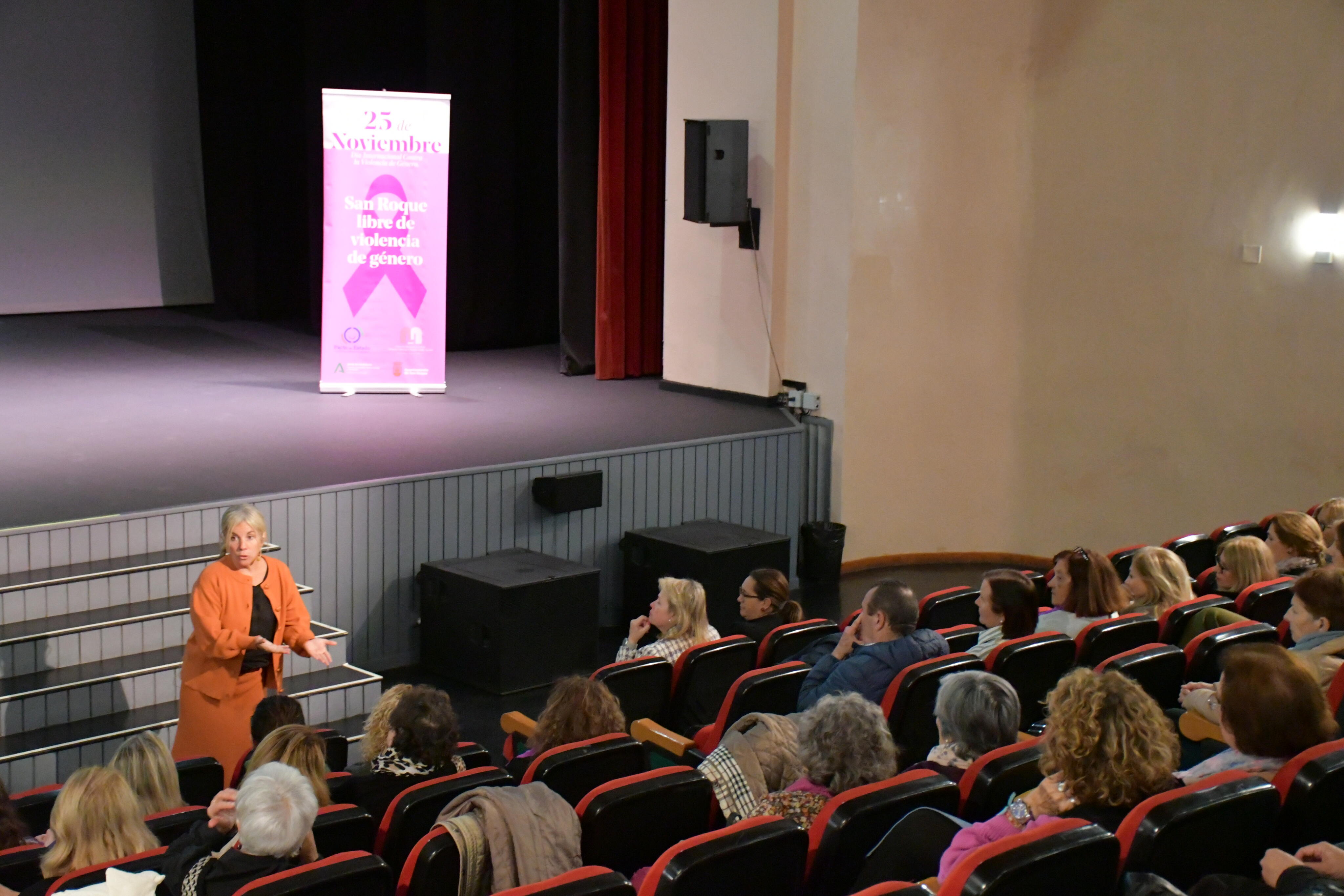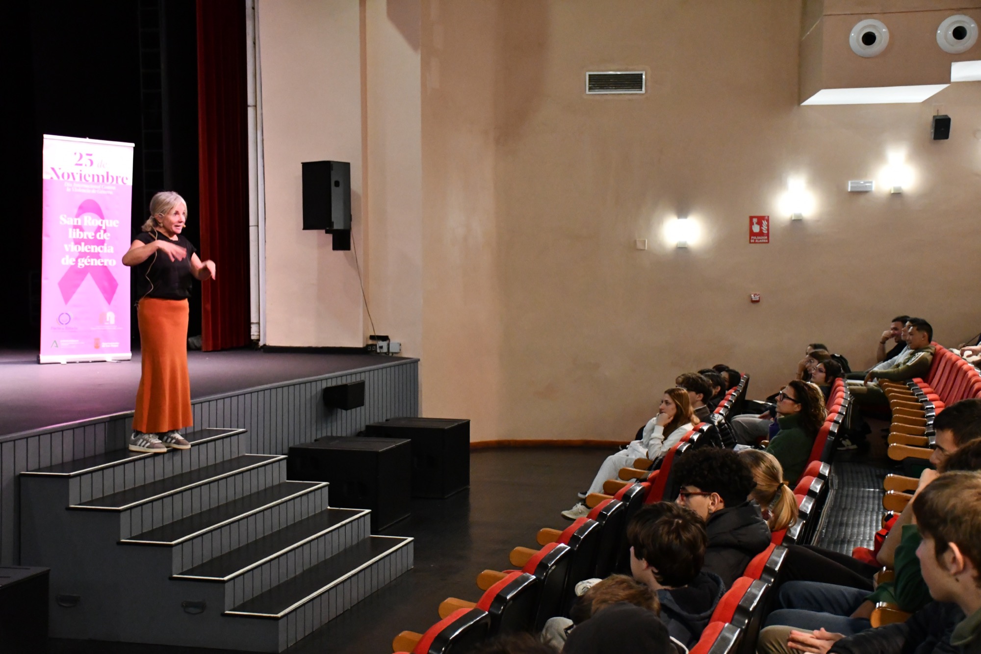 Seguidamente, en el Teatro Juan Luis Galiardo se desarrolló una charla a cargo de la pedagoga Ana Magallanes, que fue presentada por la concejal Eva Gil. Asistieron unos 300 estudiantes de Tercero y Cuarto de la ESO y Primero de Bachillerato de los dos institutos de San Roque Ciudad, quienes escucharon la participativa conferencia de esta experta en género, titulada “Relaciones de buen trato y prevención de violencia machista. Creando conciencia”, una ponencia que se ha vuelto a ofrecer, aunque esta vez para público en general, entre ellas, muchas miembros de asociaciones de mujeres del municipio, en la tarde de este martes a partir de las 19.00 horas. Previa a la conferencia, se ha repartido una pulsera con el lazo violeta a todas las asistentes.
