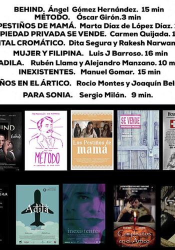 Así, mañana jueves se proyectarán los siguientes cortometrajes: “Behind”, de Ángel Gómez Hernández (15 minutos); “Método”, de Óscar Girón (3 min.); “Los pestiños de Mamá”, de Marta Díaz de López Díaz (16 min.); “Propiedad privada se vende”, de Carmen Quijada (15 min.); “Hospital cromático”, de Dita Segura y Rakesh Narwani (12 min.); “Mujer y filipina”, de Luis J. Barroso (16 min.); “Adila”, de Rubén Llama y Alejandro Manzano (10 min.); “Inexistentes”, de Manuel Gomar (15 min.); “Cumpleaños en el Ártico”, de Rocío Montes y Joaquín Belmonte (6 min.); y “Para Sonia”, de Sergio Milán (9 min.).