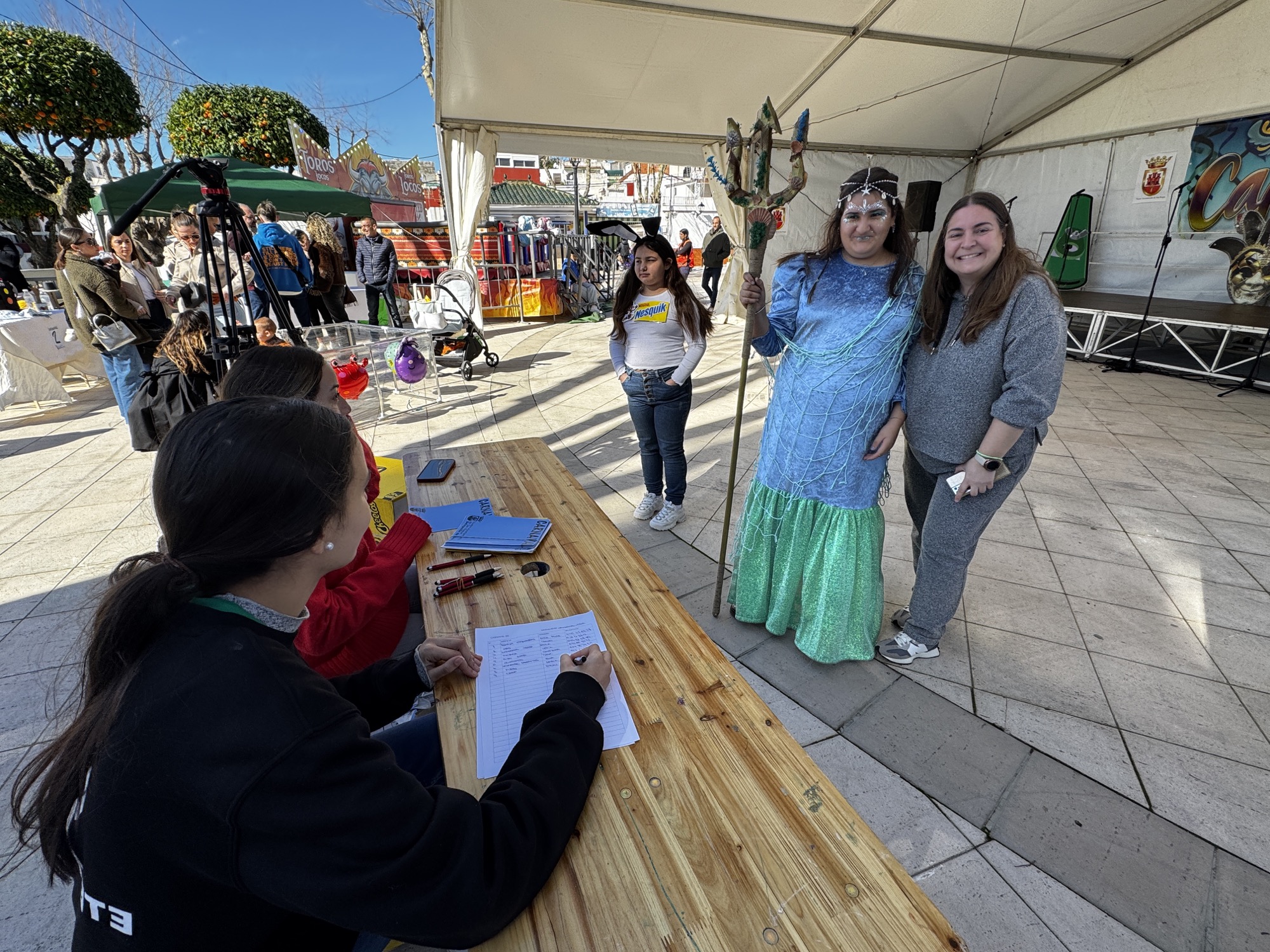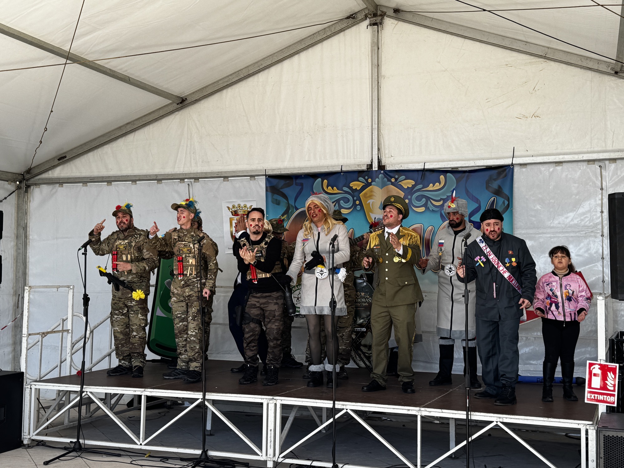 A mediodía comenzó la inscripción del concurso de disfraces infantil, con un grupo de animación posterior. A las 13.30 horas actuó la agrupación carnavalesca “Sin novedad en el frente, los hijos de Putin”. Previamente comenzaba el jurado a deliberar con la presencia de los concursantes infantiles.