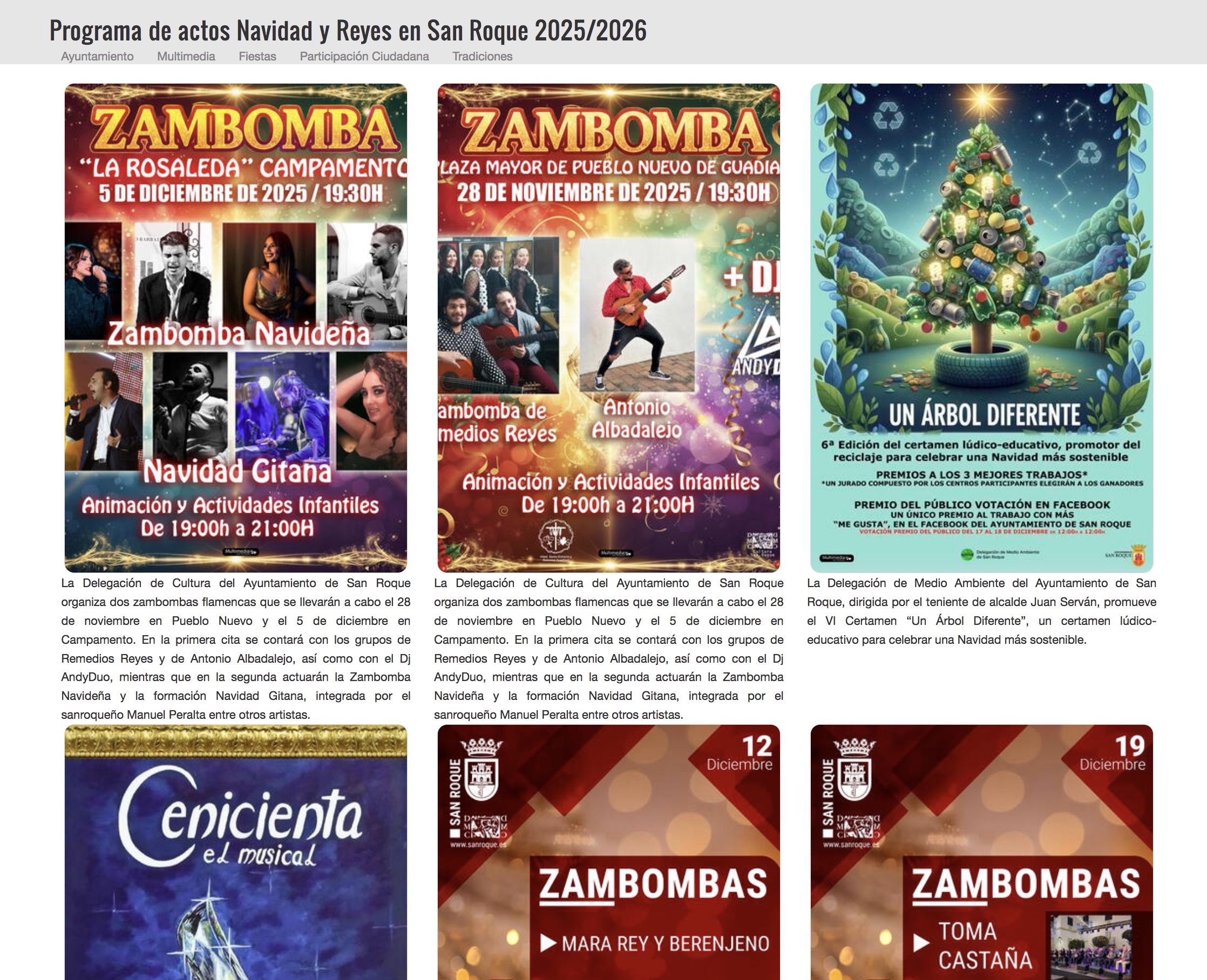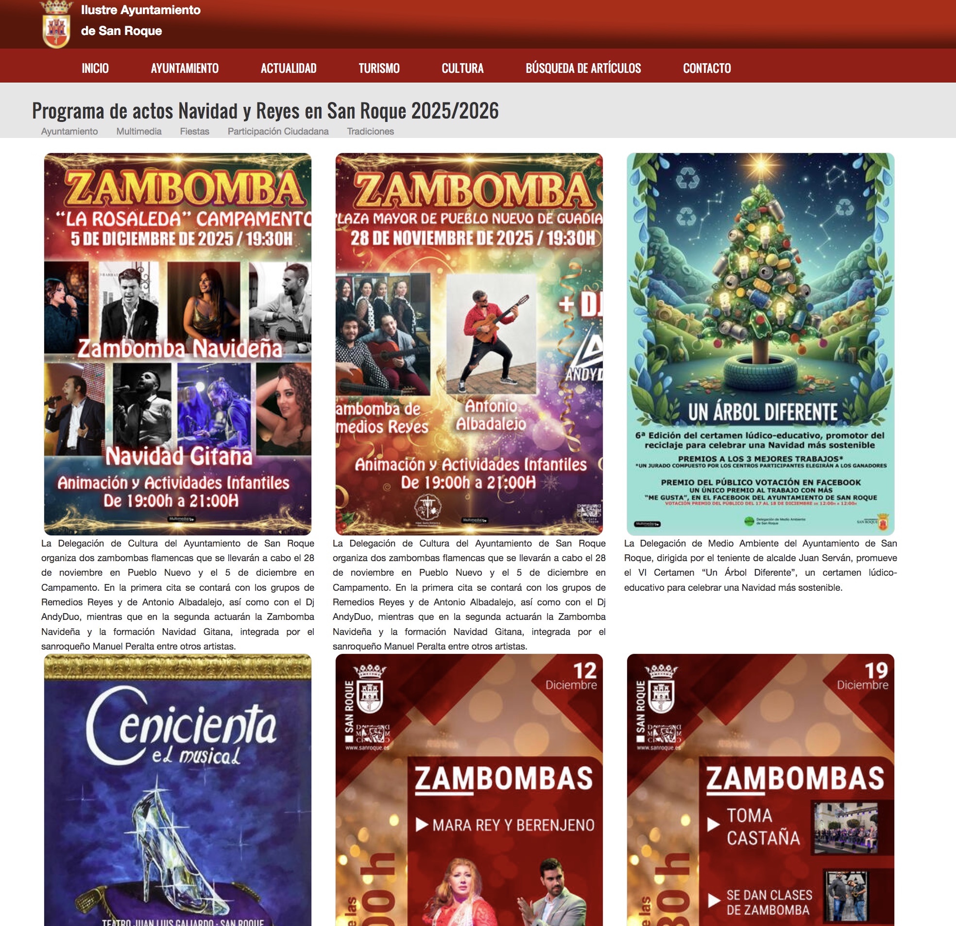 Las distintas delegaciones del Ayuntamiento han preparado una densa agenda de actividades navideñas que se podrá consultar en la página web del Ayuntamiento de San Roque: https://www.sanroque.es/navidad2025. Fecha, horarios, escenarios y tipo de eventos, junto al resto de detalles de todos y cada uno de los eventos organizados se pueden encontrar en la citada página web.