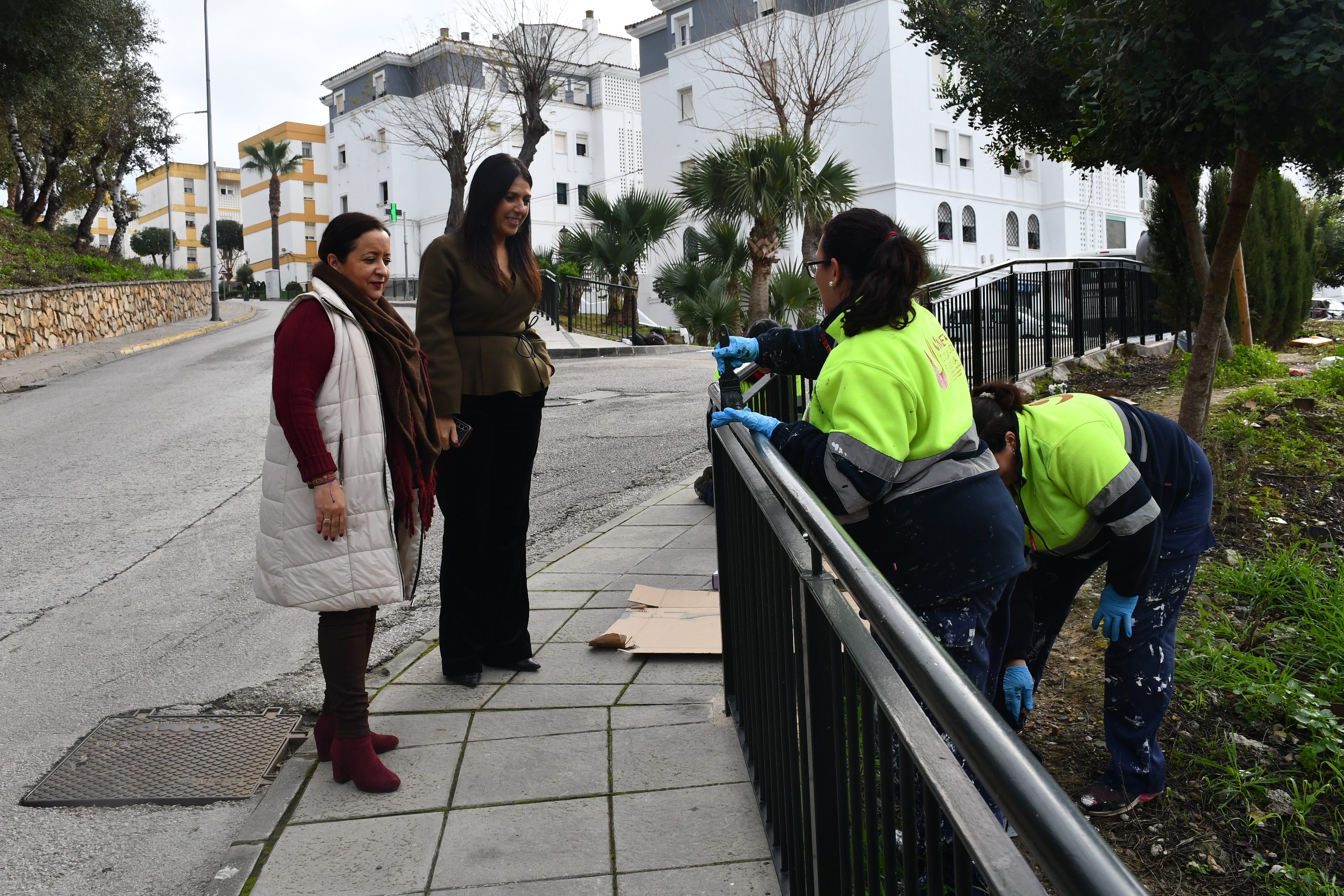 La teniente de alcalde de Obras y Servicios, Belén Jiménez, junto a la alcaldesa accidental María del Mar Collado, ha realizado una visita a los trabajos de pintura de barandillas en la zona del Chorro, en la ciudad de San Roque.