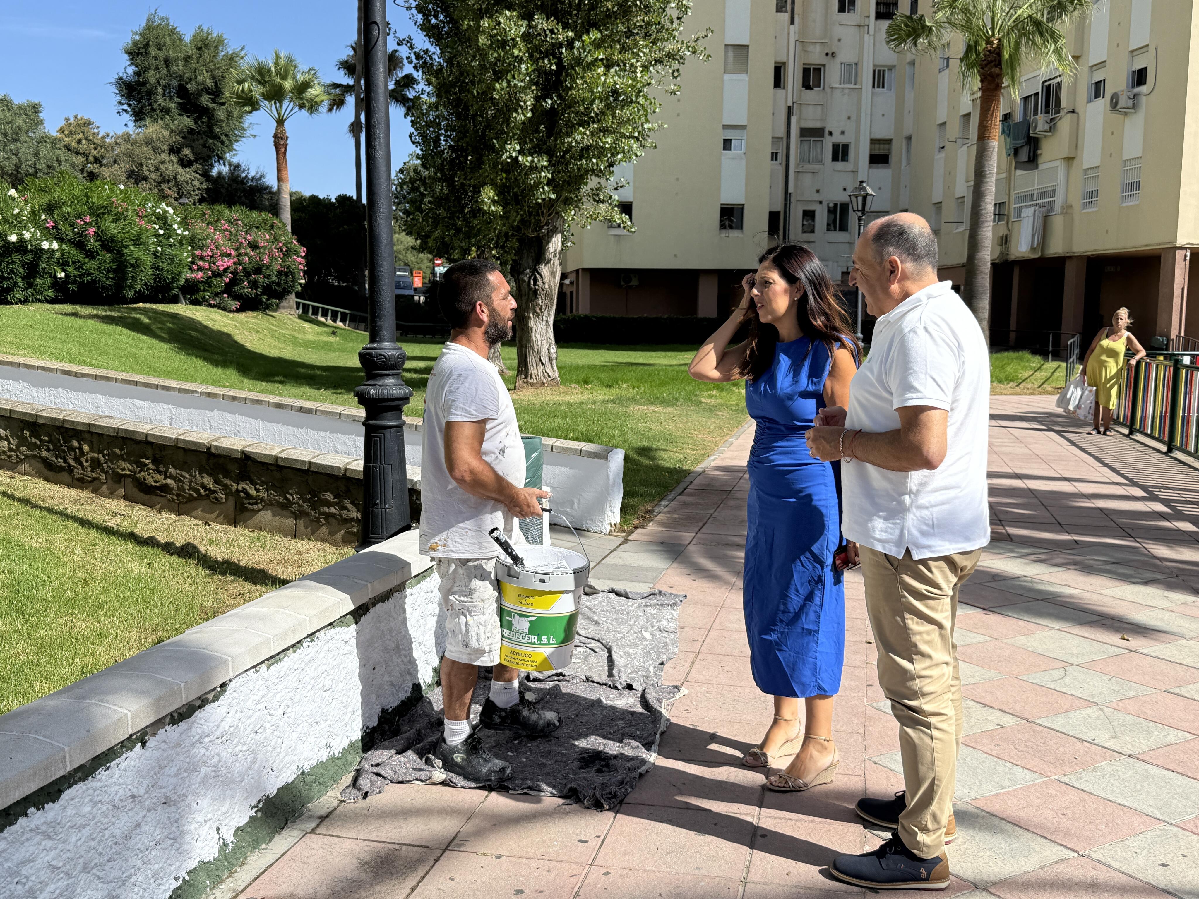El mobiliario urbano de Miraflores está siendo sometido a trabajos de pintura y rehabilitación. La teniente alcalde de Obras y Servicios, Belén Jiménez, y de la zona, Juan Serván, han visitado la barriada para comprobar la buena marcha de estas tareas.