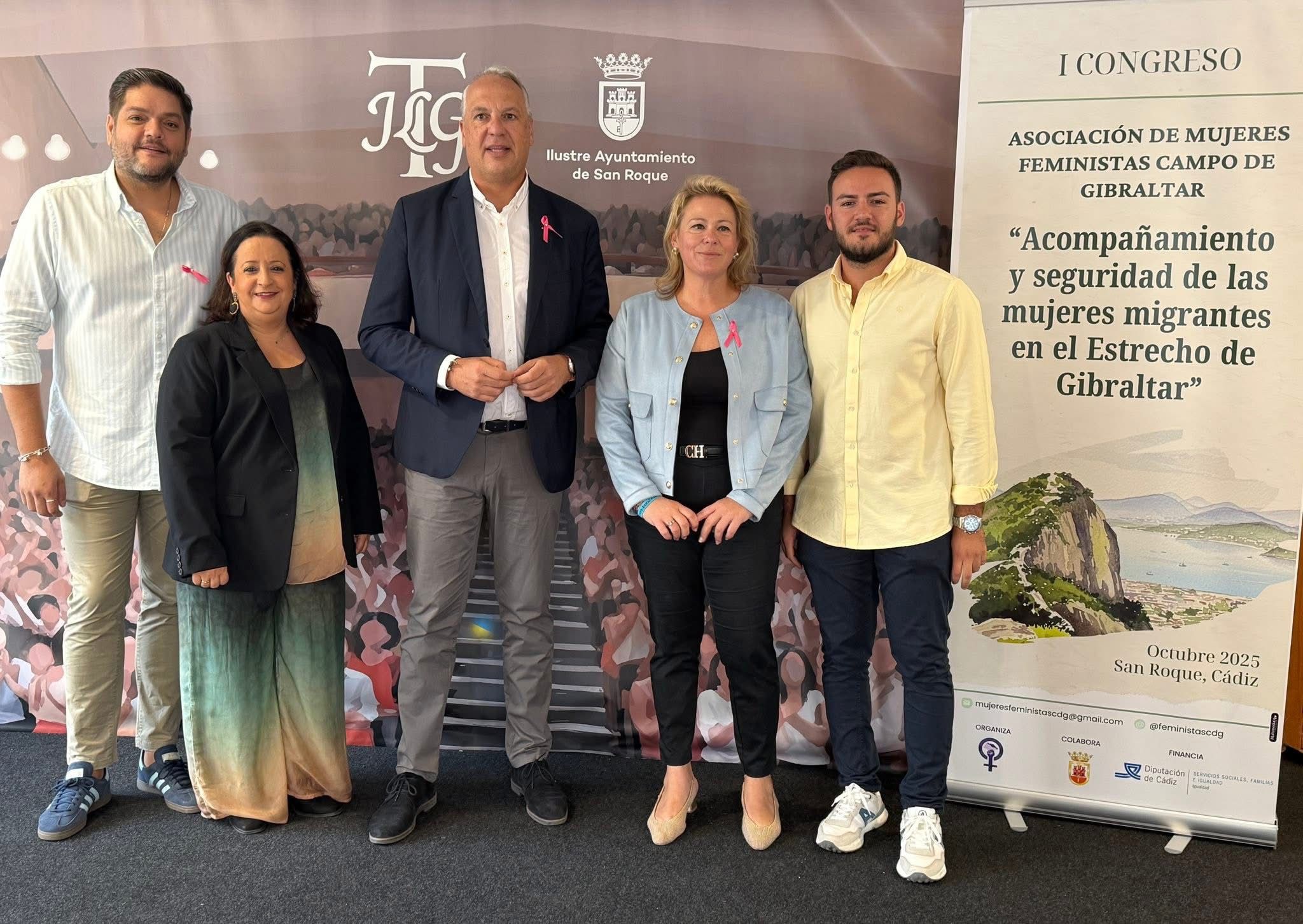 El alcalde de San Roque, Juan Carlos Ruiz Boix, junto a la presidenta de la Asociación de Mujeres Feministas del Campo de Gibraltar, Nerea Jiménez, dieron la bienvenida al primer Congreso feminista titulado “Acompañamiento y seguridad de las mujeres migrantes en el Estrecho de Gibraltar”. Un acto que se desarrolló a lo largo del sábado tanto en el Teatro Juan Luis Galiardo como en el Edificio Diego Salinas y en el que estuvieron presentes el mencionado alcalde, la delegada de Igualdad, Eva Gil, así como otros ediles de la Corporación.