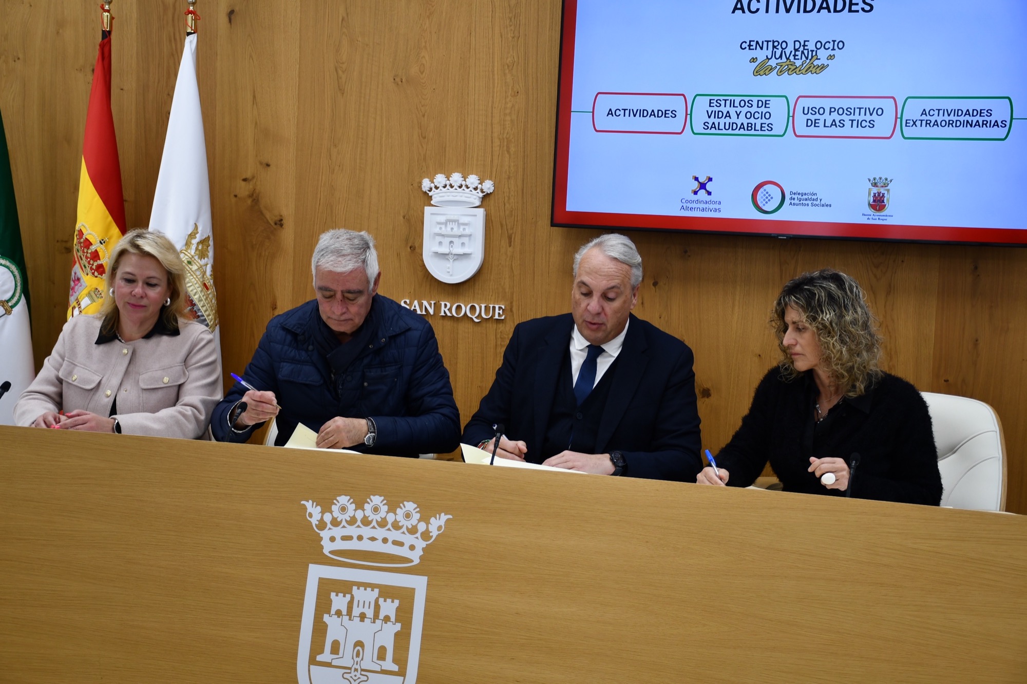 El alcalde de San Roque, Juan Carlos Ruiz Boix, y el presidente de la Coordinadora Alternativas, Francisco Mena, han suscrito un convenio de colaboración para el programa “Compleméntate”, una serie de actividades a las que este año han asistido 213 chicos y chicas de entre 12 y 17 años. En la firma también estuvieron presentes Eva Gil, como concejal del departamento organizador, Asuntos Sociales, y la secretaria general del Ayuntamiento, Ana Núñez de Cossío, como fedataria pública.