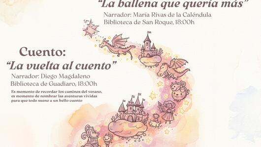 La Red de Bibliotecas de San Roque retoma los cuentacuentos de los primeros lunes de cada mes en la jornada del 6 de octubre. En esta ocasión, habrá sesión doble: “La ballena que quería más”, en el Casco y “La vuelta al cuento”, en Guadiaro.