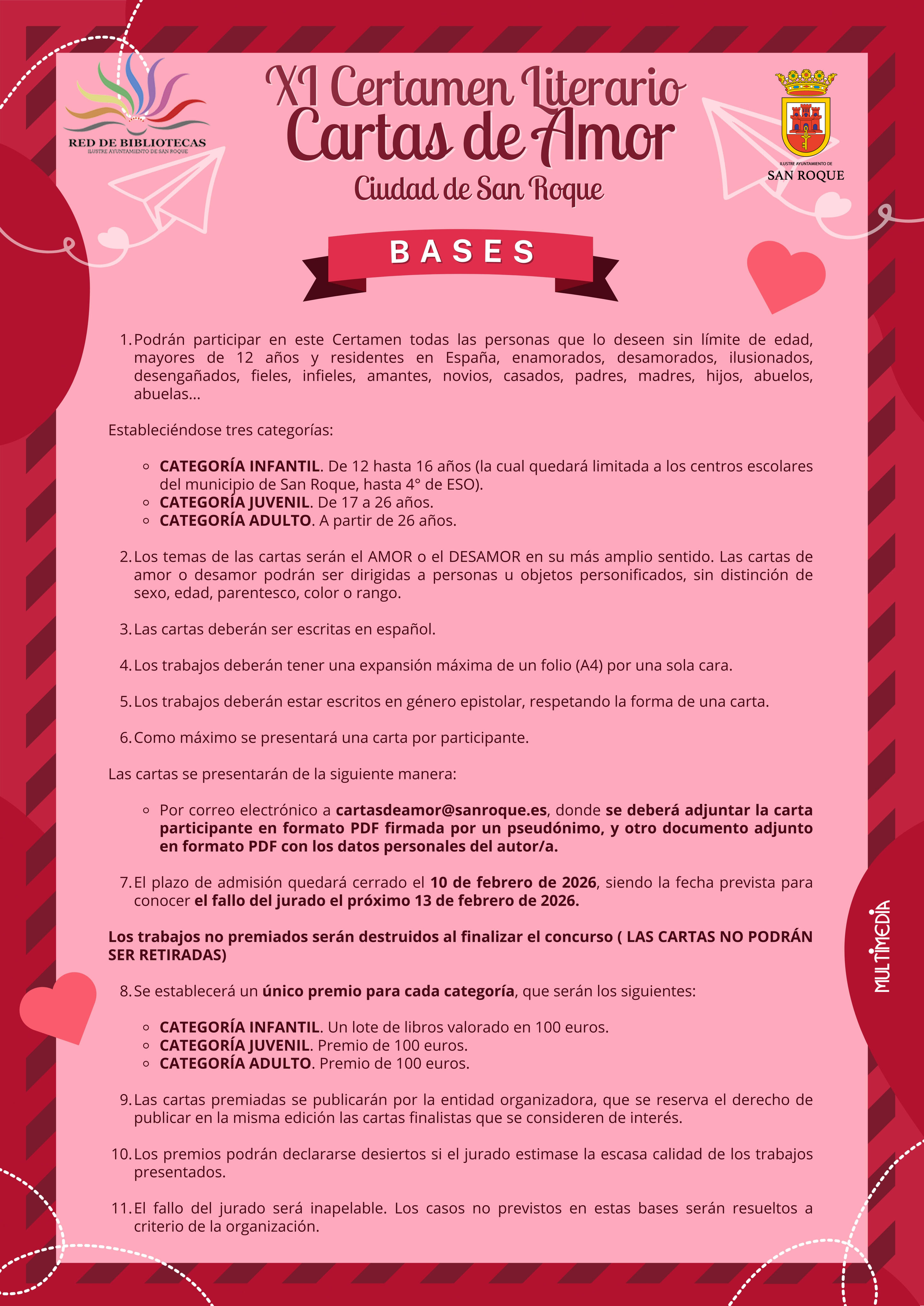 Como cada año con motivo del Día de los Enamorados, la Delegación de Bibliotecas, que dirige la concejal Rocío Fernández, pone en marcha el Certamen Literario de Cartas de Amor “Ciudad de San Roque”, que en 2026 alcanza su undécima edición. Se plantea a las personas participantes que escriban, utilizando los recursos y formas del género epistolar, textos de amor, desamor o desengaño a sus personas queridas, u odiadas.