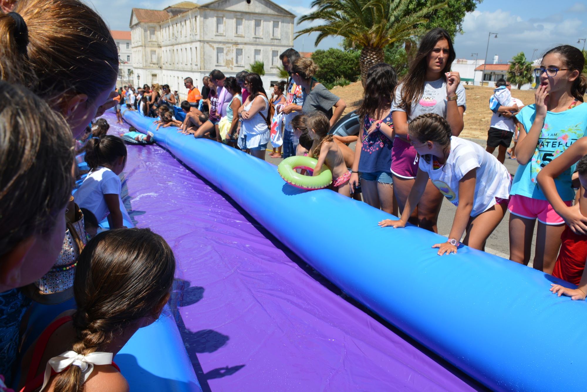 Por lo tanto, la Fiesta Infantil se prolongó hasta última hora de la tarde. Los pequeños y adolescentes han podido disfrutar, además del deslizador acuático de 50 metros, de varios castillos hinchables y otros deslizadores de menor longitud, pensados para los más pequeños.