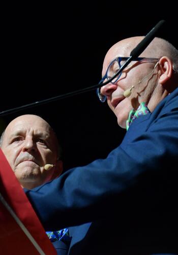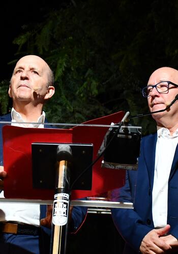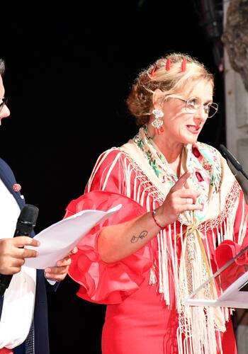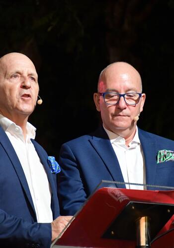 Una vez subieron al escenario reinas salientes y entrantes, así como todo el cortejo de damas, llegó el momento de un pregón original, que este año ha contado con dos pregoneros, los hermanos Juan Carlos y José Luis Lorenzo González, conocidos como “los mellizos de Antonia y Rufino”. Ambos, muy conocidos y queridos en la barriada, desplegaron ciertas notas de humor al recordar momentos célebres de la Estación de San Roque y de los que formaron parte en el pasado.