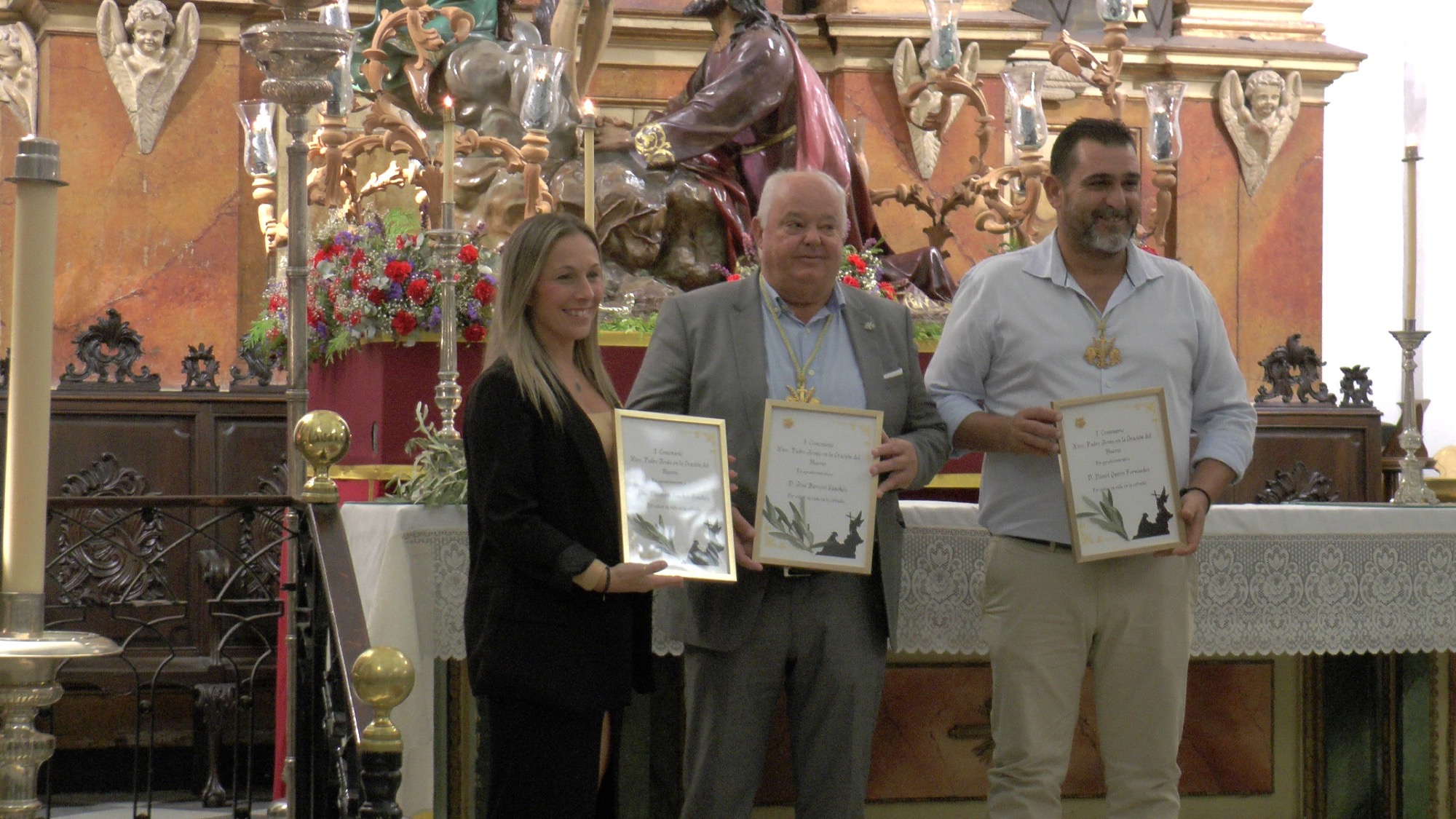 Tras la misa tuvo lugar una entrega de reconocimientos, que presentó la edil Rocío Fernández. Así, recibieron diplomas el autor del cartel anunciador de los actos del centenario, Daniel Perera, y los tres últimos hermanos mayores de la cofradía: Daniel Quirós, Elisabeth Sánchez, y el actual, José Barrero. A continuación, el encargado del Pregón del Costalero del pasado viernes 6, Manuel Zamora Barrionuevo, cantó una canción que había escrito en honor al Cristo.