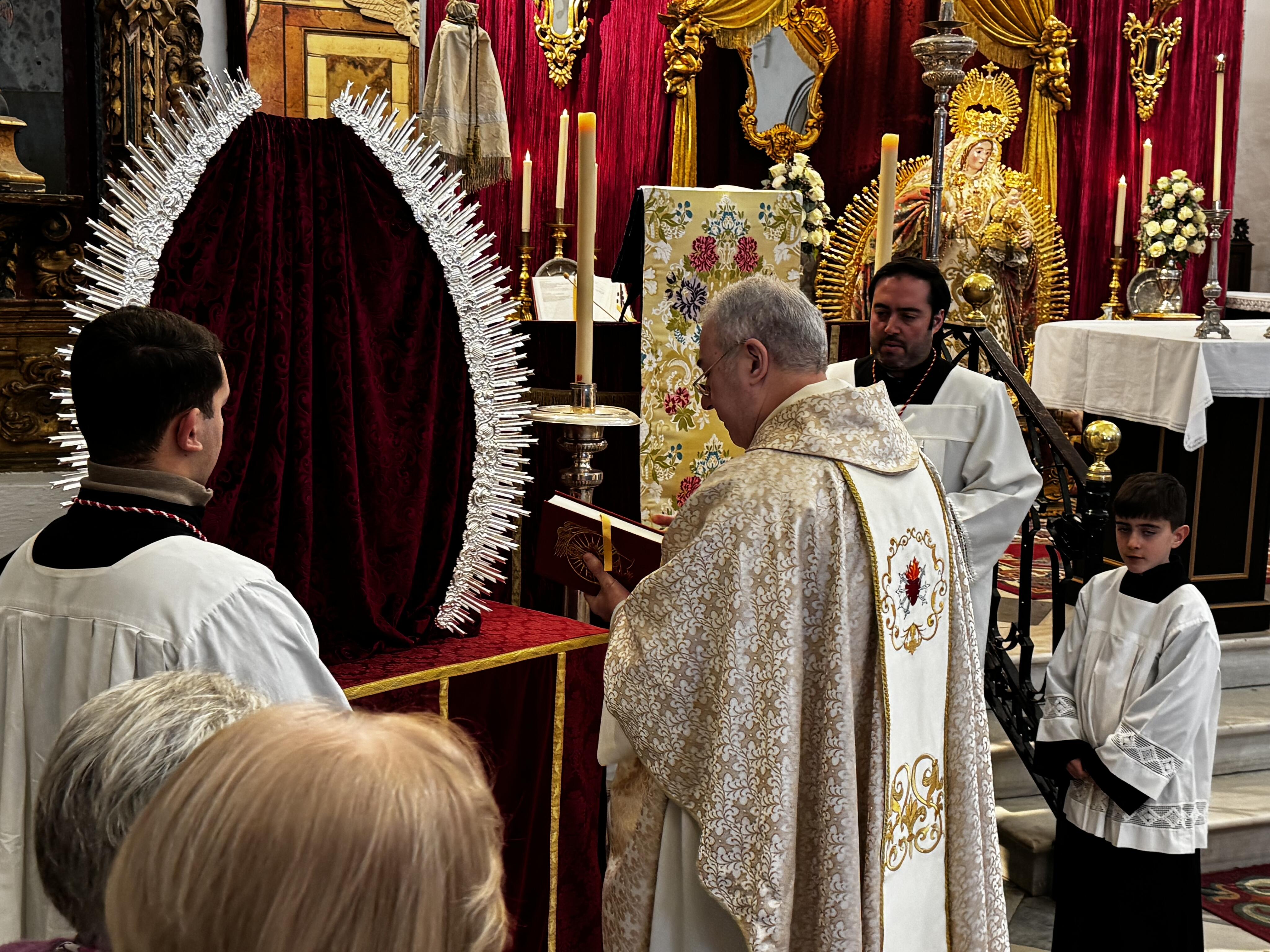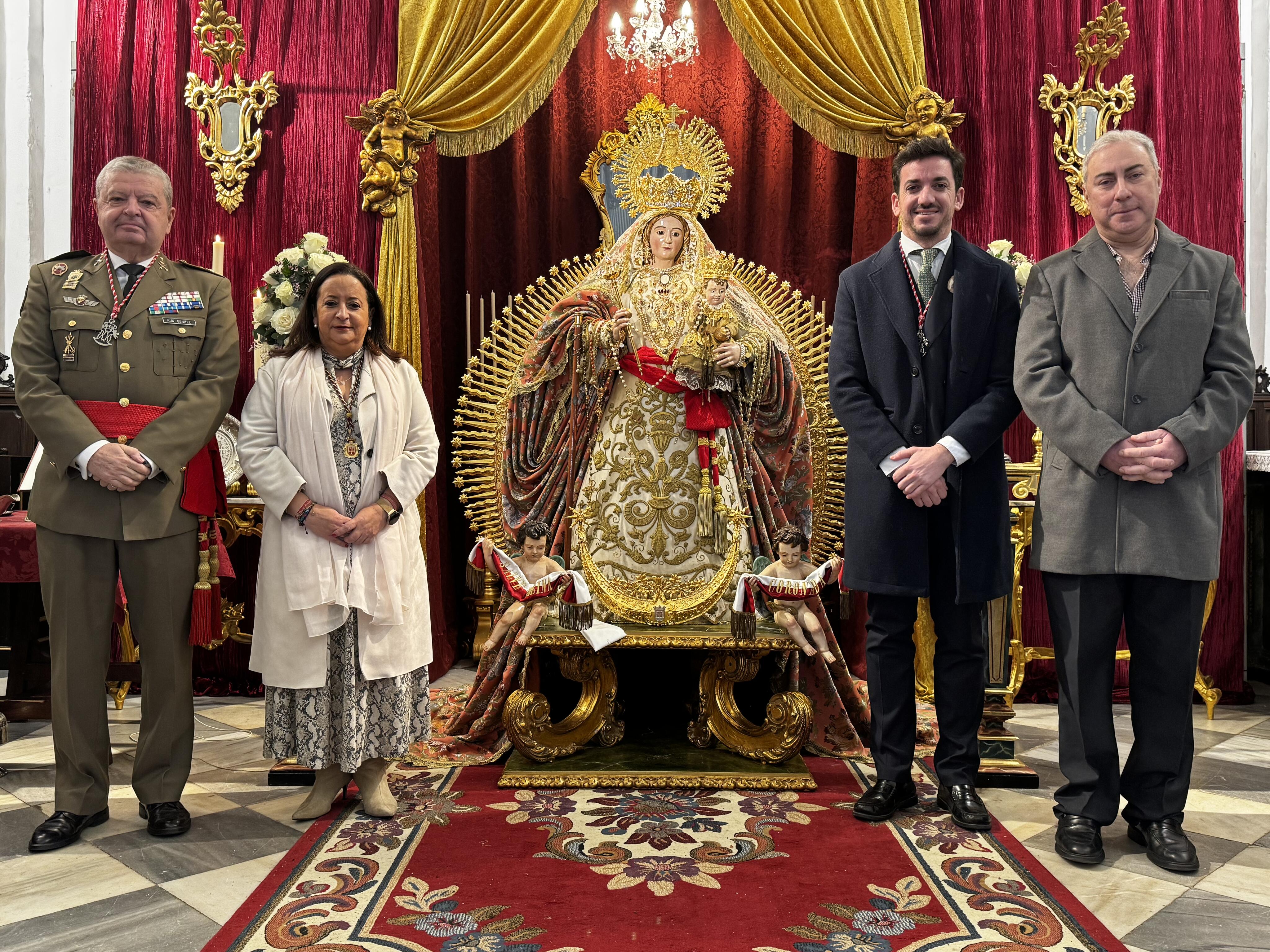 La imagen de Santa María la Coronada, se ha presentado vestida de reina en el presbiterio de nuestra Parroquia con motivo del CCCXI aniversario de su venida de Gibraltar, por el que celebramos hoy su función conmemorativa.