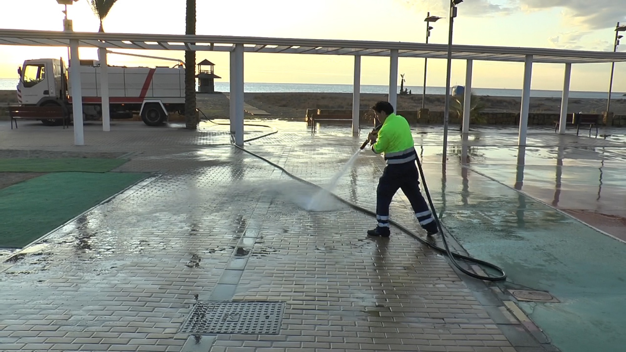 En Torreguadiaro, se ha realizado una limpieza con mangueras con agua caliente a presión por el Paseo Marítimo, especialmente en la zona donde se ubican los juegos infantiles y los módulos de salvamento.