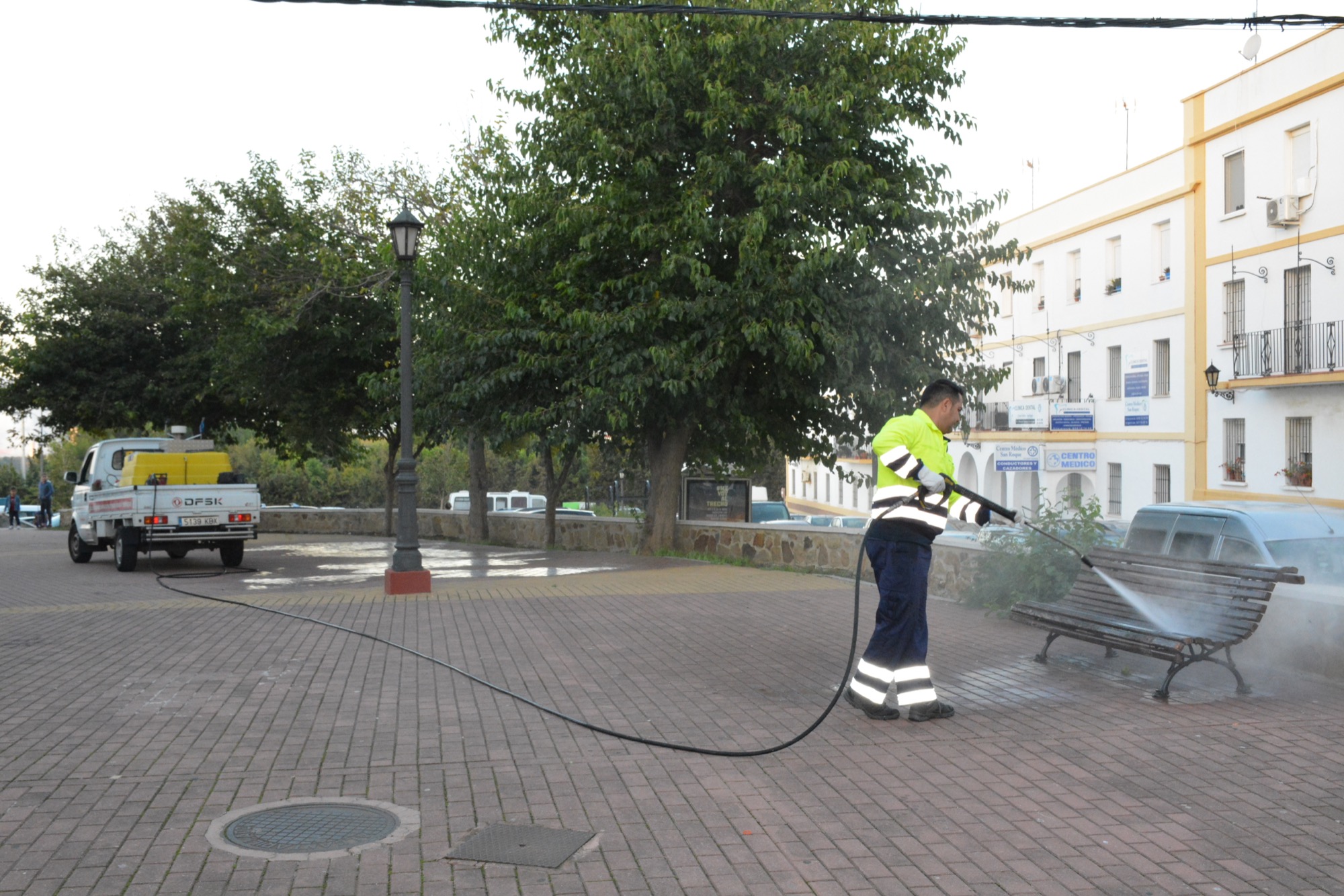 Los trabajadores de Obras y Servicios se han trasladado a otros puntos del municipio durante la jornada de hoy, jueves, para continuar con el “Plan Únete”. La limpieza que se ha realizado desde temprano ha incluido el perímetro del CEIP Santa Rita de Campamento y las inmediaciones de la Plaza de Toros de San Roque.
