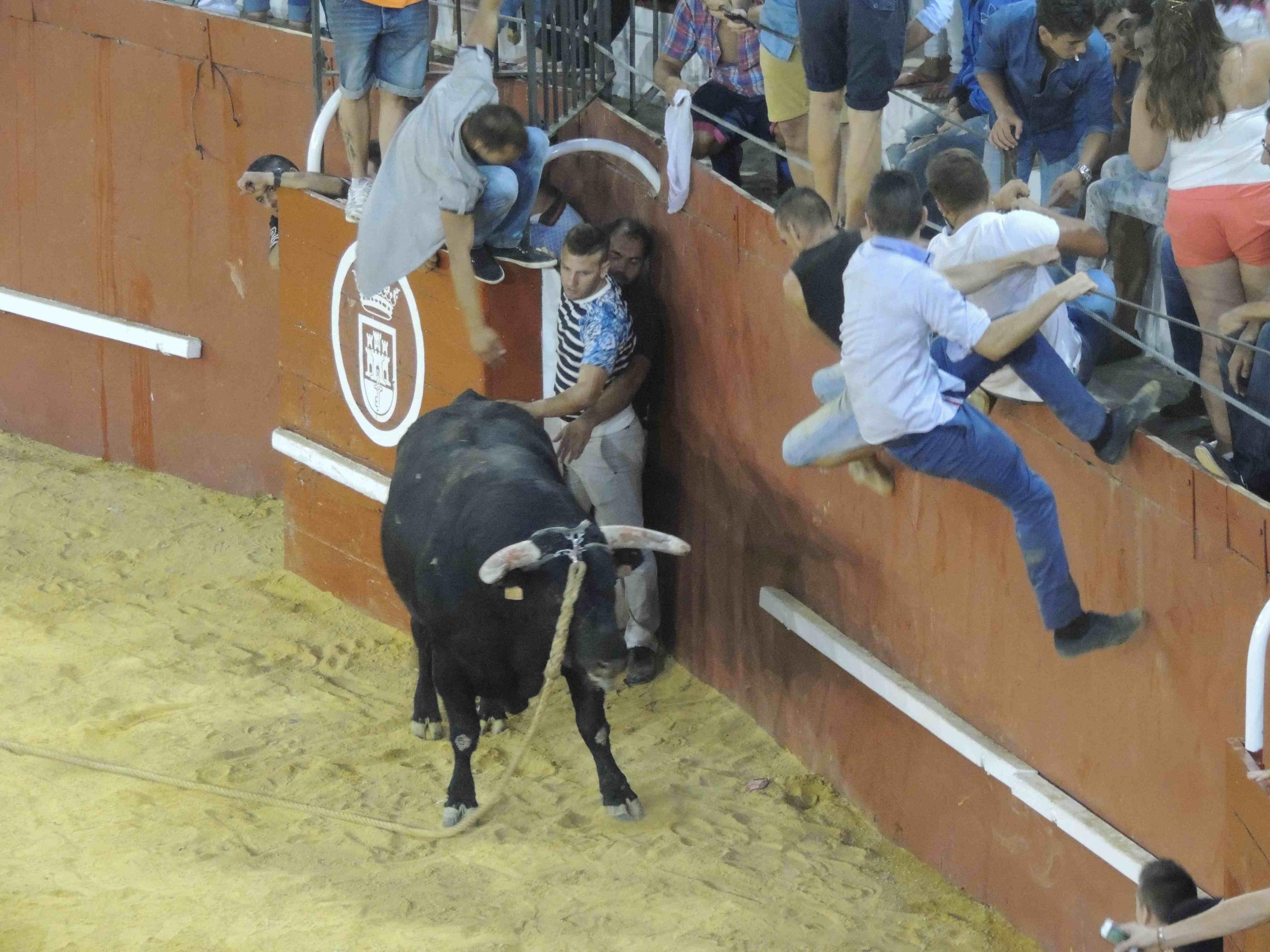 Se calcula que un centenar de jóvenes “corren” al toro desde la barriada de la Paz y más de 5.000 personas se concentran en la plaza para ver el encierro del Toro del Aguardiente. Los miembros de esta peña se encargan de conducir al animal a la Plaza de Toros tirando de una cuerda, y también de velar por la seguridad de los asistentes durante el encierro, tanto del toro como de las vaquillas que se sueltan a continuación.