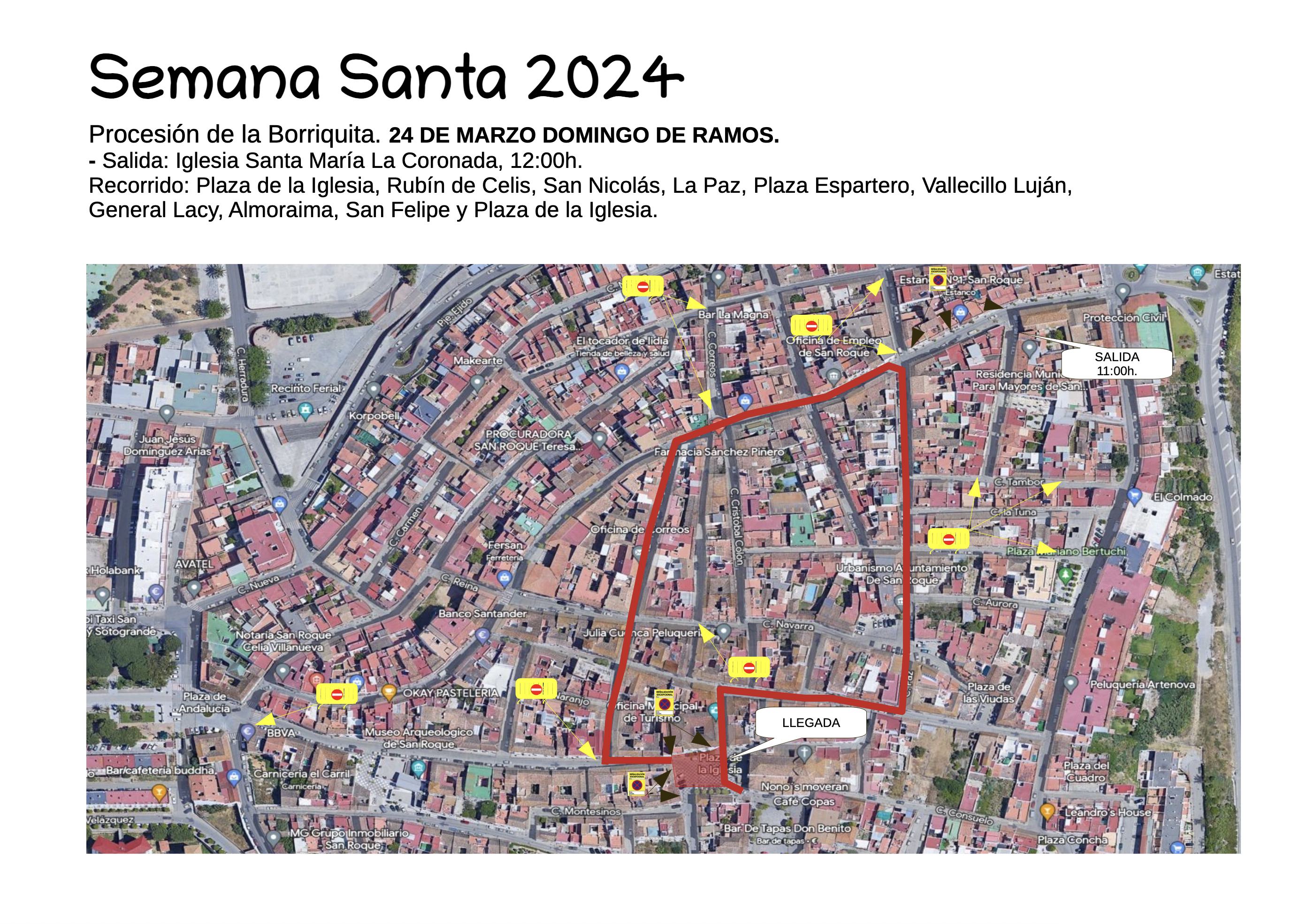 Respecto a la Procesión Juvenil de Cristo Rey en Su Triunfal Entrada en Jerusalén, “La Borriquita, a cargo del Grupo Joven de la Hermandad del Rocío de San Roque, hay que señalar que se trata del segundo año que se celebra, y que comenzará al finalizar la misa en la Parroquia, aproximadamente a las 12.00 horas. El itinerario es el siguiente: Plaza de la Iglesia, Rubín de Celis, San Nicolás, La Paz, Plaza Espartero, Vallecillo Luján, General Lacy, Almoraima, San Felipe y Plaza de la Iglesia.
