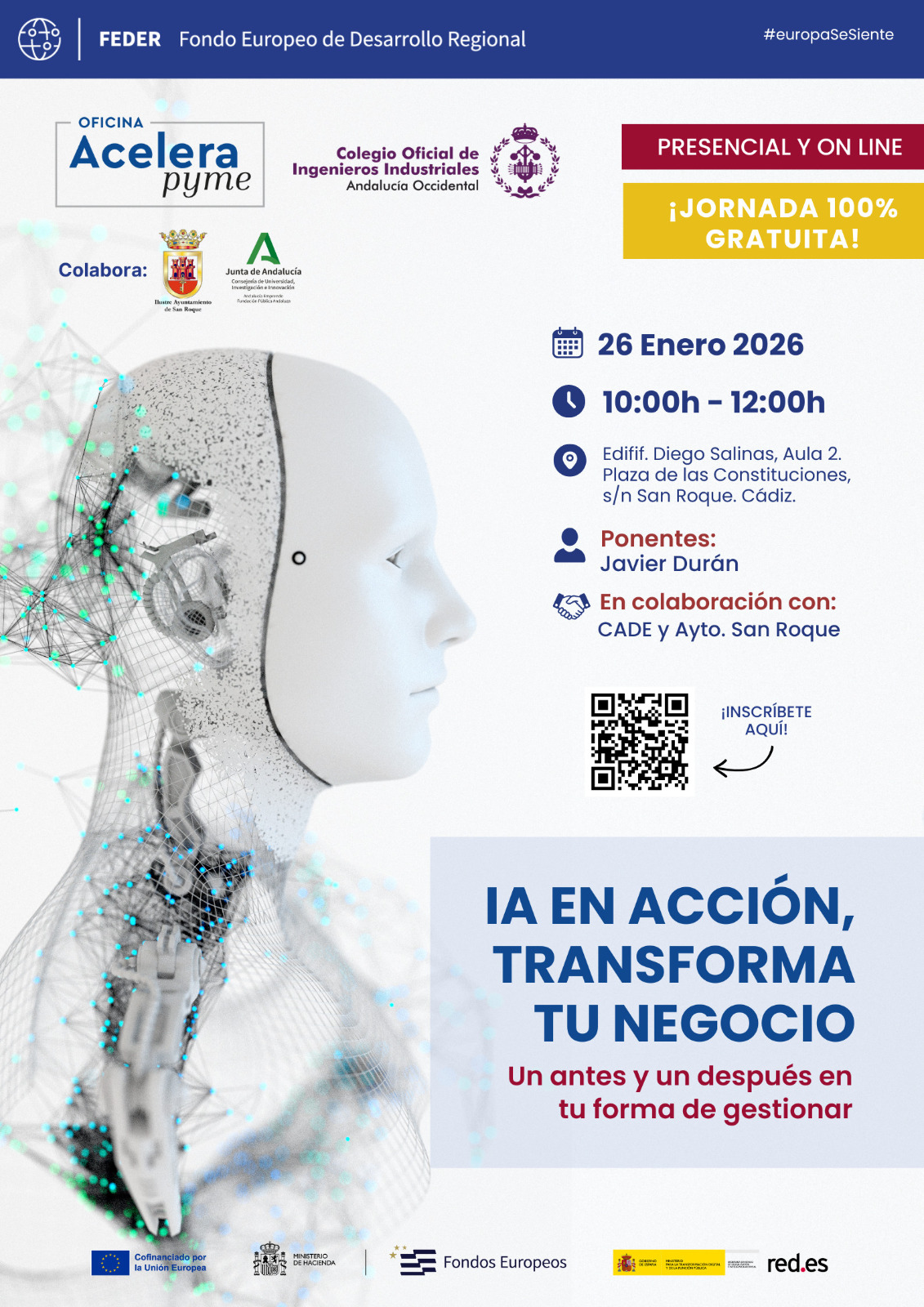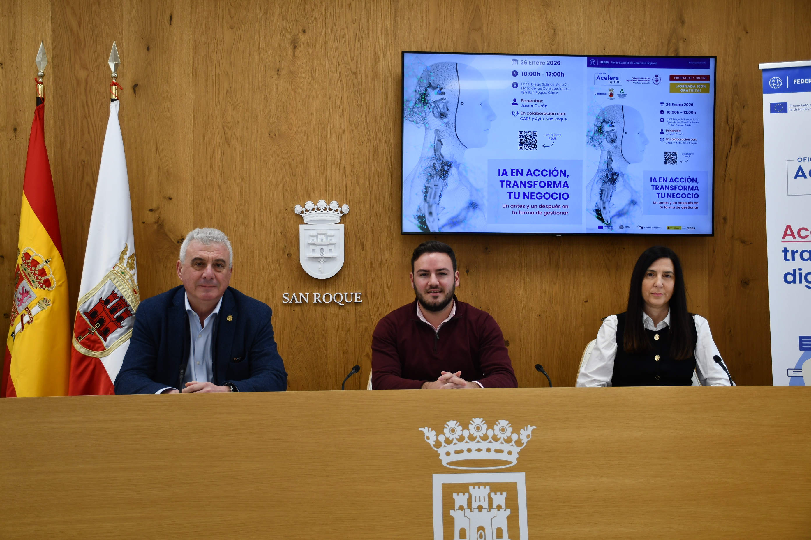 El teniente de alcalde delegado de Empleo, Fernando Vega, ha presentado la jornada informativa denominada “IA en acción, transforma tu negocio. Un antes y un después en tu forma de gestionar”, donde el ponente Javier Durán ofrecerá una charla de dos horas de duración auspiciada por la Oficina “Acelera Pyme”, el Colegio de Ingenieros Industriales, la Junta de Andalucía, y el Ayuntamiento de San Roque, a través de la Delegación de Empleo y Amdel.