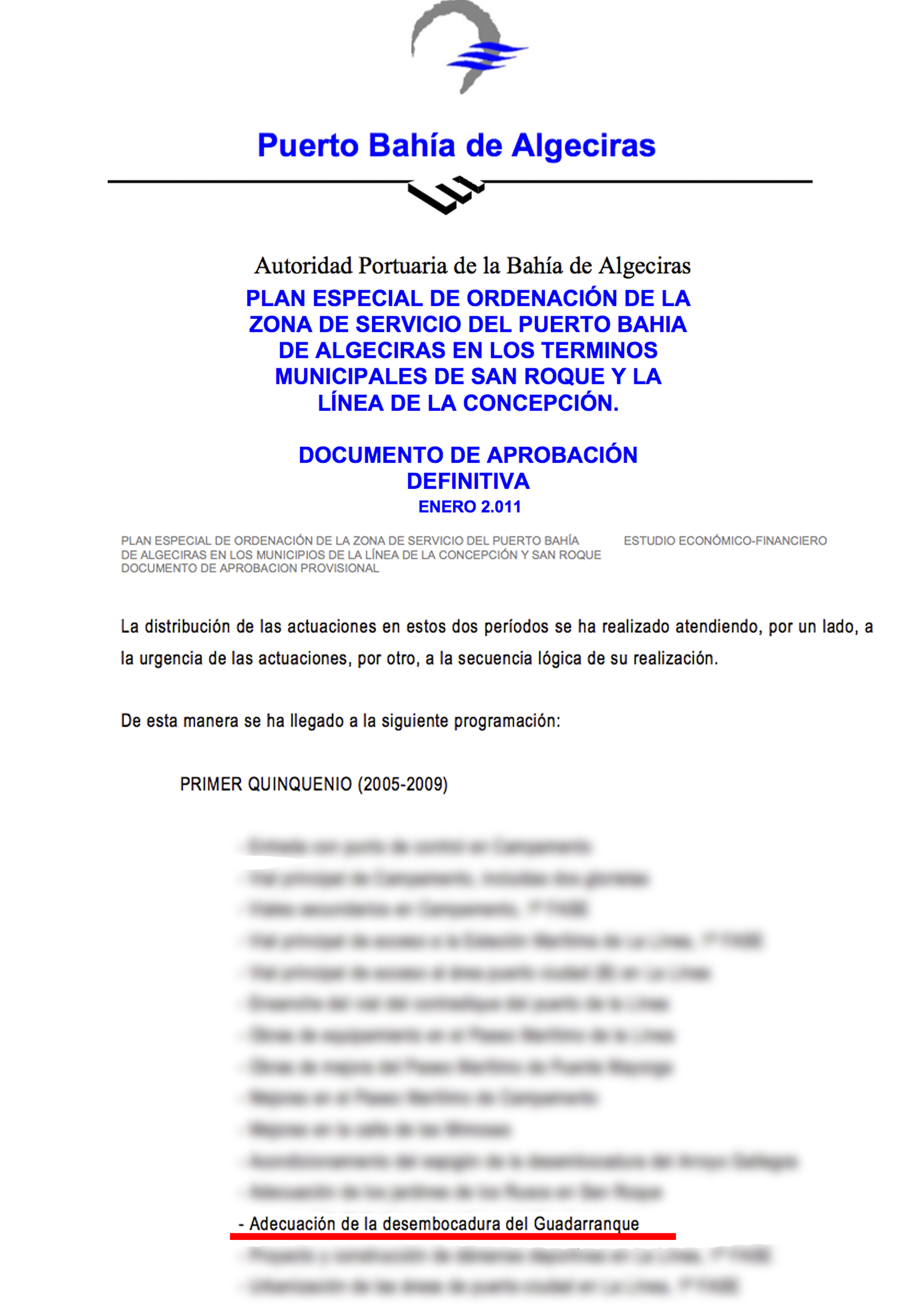 El alcalde recuerda lo firmado en 2011, el Plan Especial de la zona de Servicio del Puerto Bahía de Algeciras en los términos municipales de San Roque y La Línea, que preveía una inversión de 345 mil euros en 5 años para adecuar la desembocadura del rio Guadarranque, “algo que tampoco se ha cumplido en los 5 años de vigencia del acuerdo”.