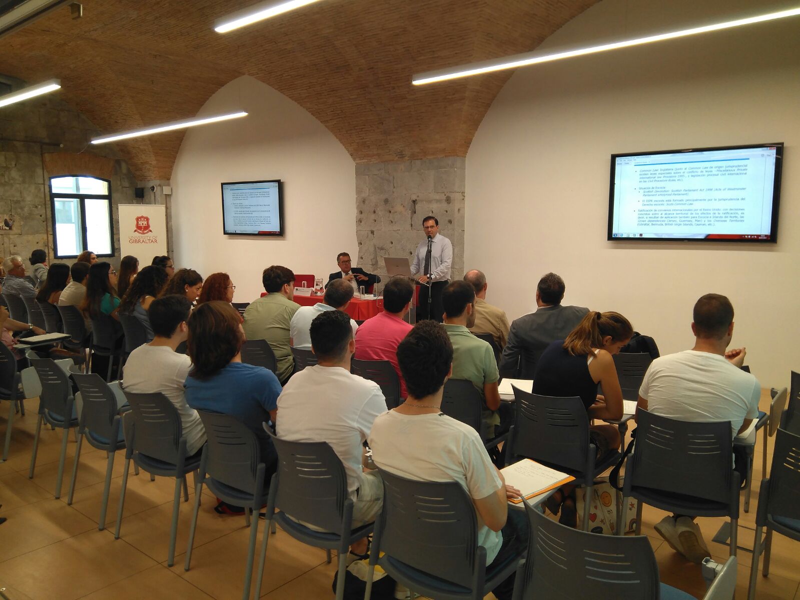 La jornada de hoy se ha completado con dos ponencias, la "Cooperación judicial civil internacional entre España y Gibraltar en la UE: opciones ante el Brexit" a cargo del profesor titular de Derecho Internacional Privado UCA, Miguel Checa, y "El Brexit y Gibraltar: las aguas de la bahía" impartida por el catedrático de Derecho Internacional Público de la Universidad de Alcalá, Carlos Jiménez.