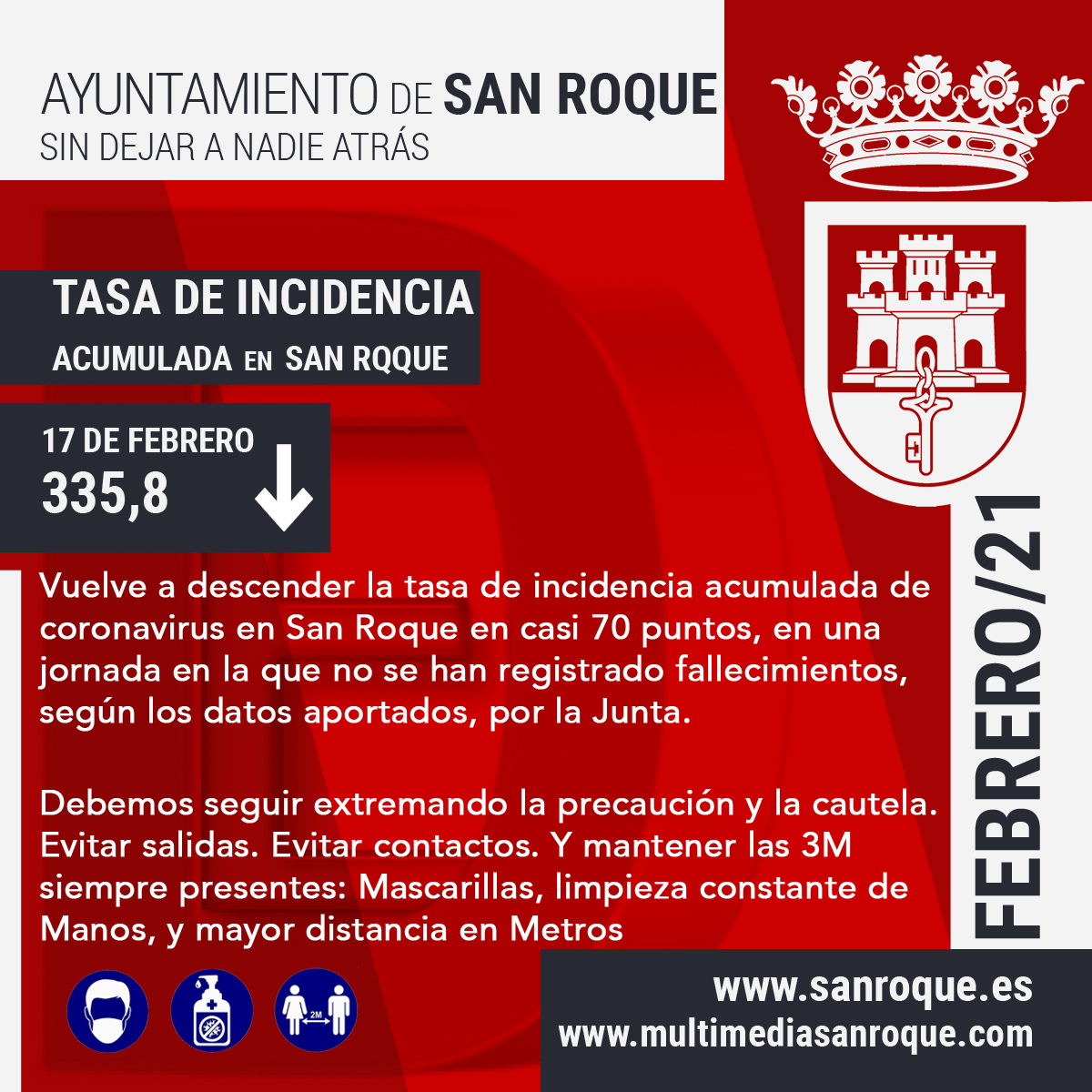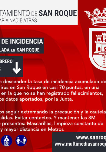 El alcalde de San Roque, Juan Carlos Ruiz Boix, ha pedido seguir actuando con precaución y cautela, pese a la bajada de datos referentes a la incidencia del Covid en el municipio. En concreto, la cifras de hoy dan un descenso de 69,6 puntos, por lo que la Tasa de Incidencia Acumulada pasa de 405,4 a 335,8.