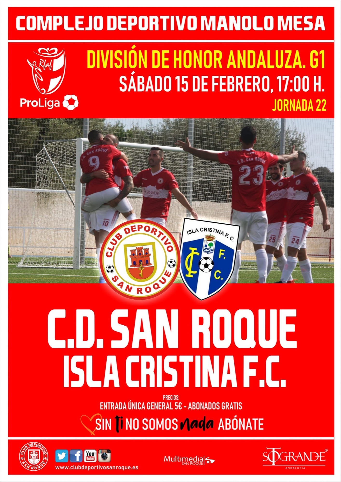 El CD San Roque busca romper su racha de cuatro jornadas sin ganar, a costa de un Isla Cristina C.F. que llega al Municipal Manolo Mesa con solo una victoria fuera de casa, cinco empates y cuatro derrotas, en un partido que se presenta determinante para el futuro del conjunto onubense, que roza los puestos de descenso. El encuentro, adelantado al sábado 15 de febrero, corresponde a la jornada 22 del curso y está previsto que comience a las 17.00 horas. Arbitrará el colegiado sevillano Caro Márquez.