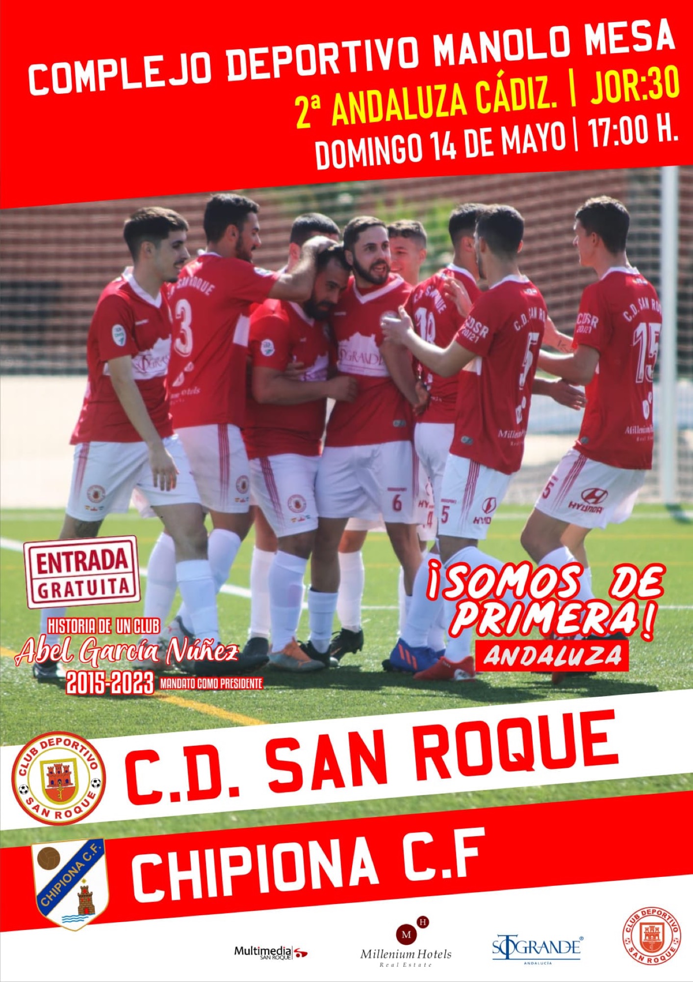 El Complejo Deportivo Manolo Mesa acogerá el próximo domingo la celebración del ascenso del CD San Roque a Primera Andaluza Cádiz. El equipo rojillo se enfrentará al Chipiona CF a partir de las 17.00 horas, en un partido que tendrá entrada gratuita para que la afición comparta con la plantilla, técnicos y directivos de la entidad la alegría conseguida hace unos días, cuando al finalizar la jornada número 29 de liga se certificó la tan trabajada subida de categoría.