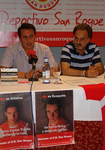 El acto se celebró en la sala de conferencias de “The Suites at San Roque Club” y contó con la presencia del teniente de alcalde delegado de Juventud, José Antonio Rojas; el presidente del CD San Roque, Francisco Javier Barberán; Juan Luis Gil, gerente de la empresa que se ha encargado de la publicidad de la campaña de abonados, “Expresion”; y el nuevo jefe de prensa de entidad. El “speaker” del club, Roberto Collado, fue el encargado de la presentación. Juan Luis Gil explicó que para esta campaña de captación de abonados han querido jugar con que tanto los jugadores del Club Deportivo San Roque como los de la Selección Española visten camisetas rojas. “Hemos querído aprovechar -dijo- el entusiasmo que se ha vivido y aún se vive por los logros conseguidos por la selección nacional de fútbol, para intentar que ese entusiasmo se plasme también en el equipo local”. Para ello, “el enfoque y diseño en la cartelería está basado en las diferentes campañas que ha realizado la propia Selección Nacional, para de esa forma, conseguir que todos se sientan identificados y captar el mayor número posible de abonados”. Por su parte, Antonio Barranco agradeció a la directiva del CD San Roque la confianza que ha depositado en él y habló de “lo importante y necesario de un responsable de prensa que canalice la información del club y la distribuya a todos los medios”. Asimismo, recordó “que a lo largo de la temporada pasada todos los medios de comunicación en algún momento hicieron referencia a la necesidad de que el club tuviese un responsable de prensa”. En su intervención, el presidente del C.D. San Roque, Francisco Javier Barberán, quiso hacer especial hincapié en agradecer a la dirección de “The Suites at San Roque Club” el ceder las instalaciones, tanto para la presentación de este acto, como para la realización de la pretemporada del equipo que comenzó el pasado día 13 de julio. Barberán agradeció la presencia del teniente de alcalde José Antonio Rojas y excusó la ausencia del alcalde diciendo que “como buen aficionado que es al equipo, me consta que le ha sido imposible venir ya que su deseo era estar con nosotros hoy”. El presidente felicitó a “Expresión” por “el magnífico trabajo que habéis realizado en esta campaña de captación de abonados”. Una campaña que según palabras de Barberán “está enfocada con un gran acierto en la imagen de los propios jugadores del club, ya que ellos, que apenas cobran nada, son los verdaderos protagonistas de los logros que hemos conseguido y podamos conseguir en un futuro”. Finalmente Barberán se despidió diciendo que “Nuestro pueblo se merece un equipo de fútbol en tercera división”. Para cerrar el acto tomó la palabra José Antonio Rojas, quien en primer lugar excuso la ausencia por motivos de agenda del alcalde de la Ciudad, Juan Carlos Ruiz. Dijo el edil que “es un placer estar aquí con vosotros y me entusiasma ver la mucha ilusión que hay en esta mesa”, añadiendo también “me gusta mucho la idea de la campaña de captación de abonados, así como el abono joven que habéis preparado para todos los que presenten el carnet joven”.