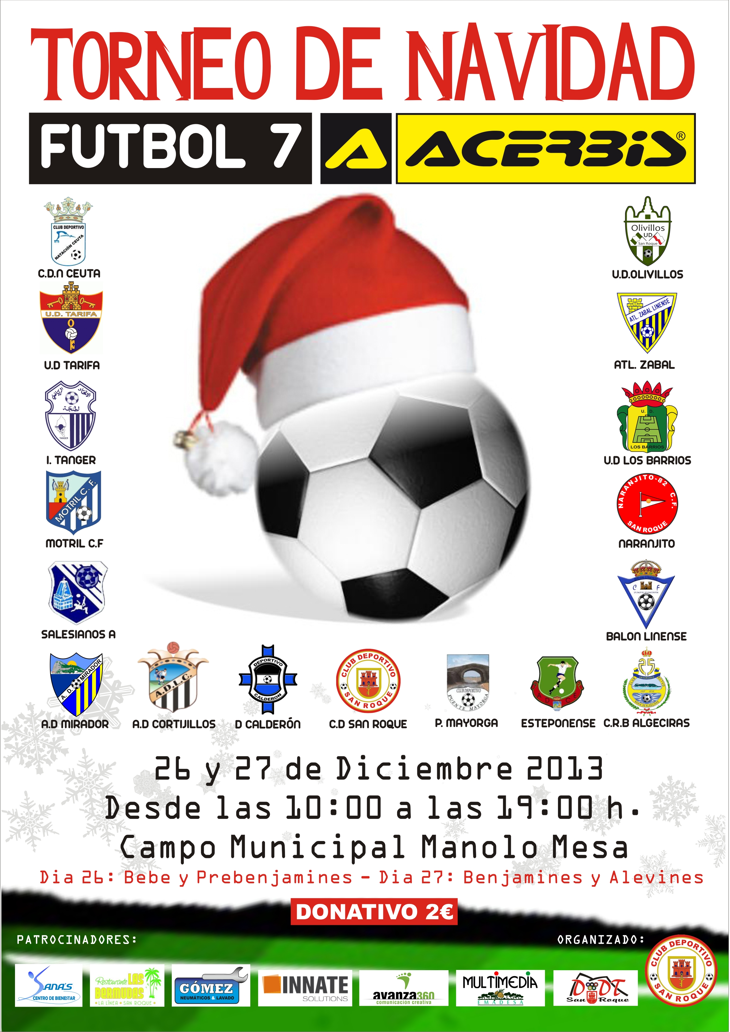 El salón del Edificio Diego Salinas, ha sido el escenario de la presentación y sorteo del calendario correspondiente al Torneo de Navidad de Fútbol 7 a celebrarse los días 26 y 27 de diciembre en el Estadio Municipal Manolo Mesa. En el certamen tomarán parte más de 200 niños en los diferentes encuentros para las categorías de Bebé, Prebenajamines, Benjamines y Alevines.