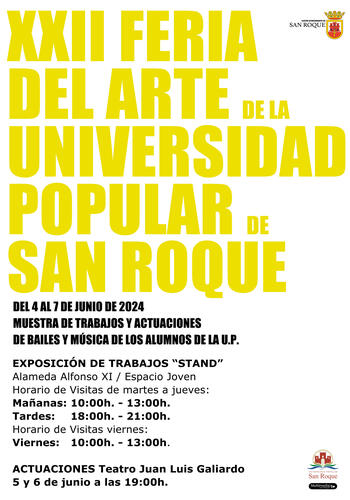 La Universidad Popular de San Roque celebra la próxima semana su XXII Feria del Arte, con las tradicionales exposiciones de trabajos en la Alameda Alfonso XI y en el Espacio Joven y con actuaciones en el Teatro Juan Luis Galiardo de los talleres de artes escénicas. Las actividades se prolongarán de martes a viernes.