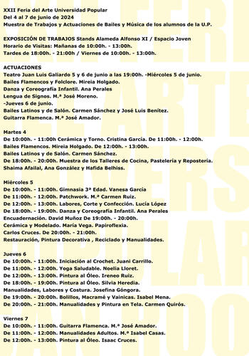 La exposición del trabajo de los talleres tendrá lugar, como ocurre en los últimos años, en una serie de puestos montados en la Alameda Alfonso XI, así como en el Espacio Joven. En este caso, el horario de visitas será de 10.00 a 13.00 horas y de 18.00 a 21.00, si bien el viernes será tan sólo en horario matinal. En cuanto a las actuaciones del Teatro Juan Luis Galiardo, se desarrollarán el miércoles y el jueves a partir de las 19.00 horas.